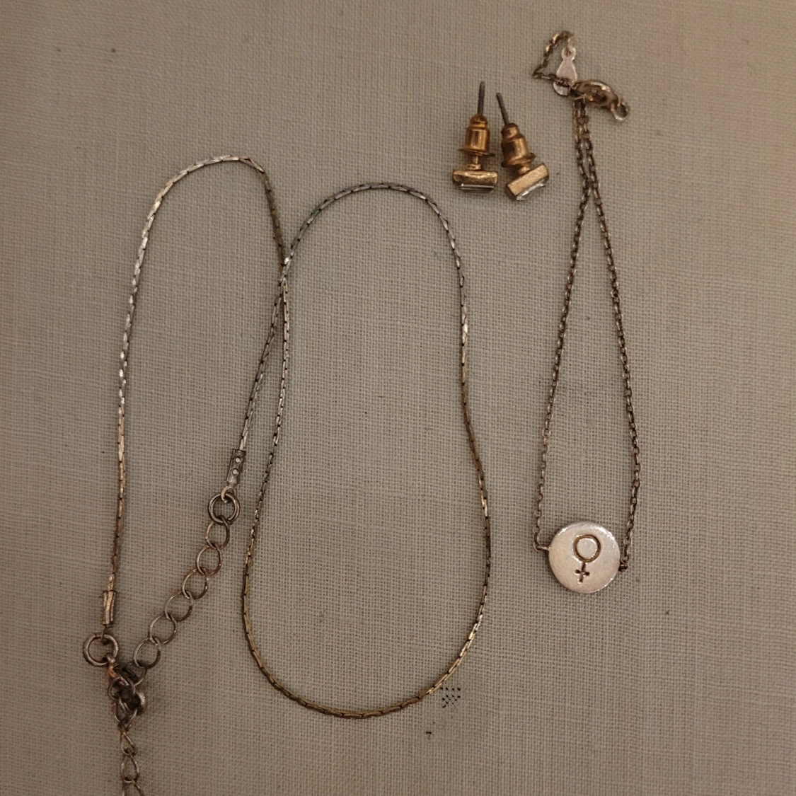Set av enkla guldfärgade smycken. En halskedja, ett armband med venussymbol och ett par gulliga örhängen med genomskinliga stenar. Oanvända i felfritt skick.