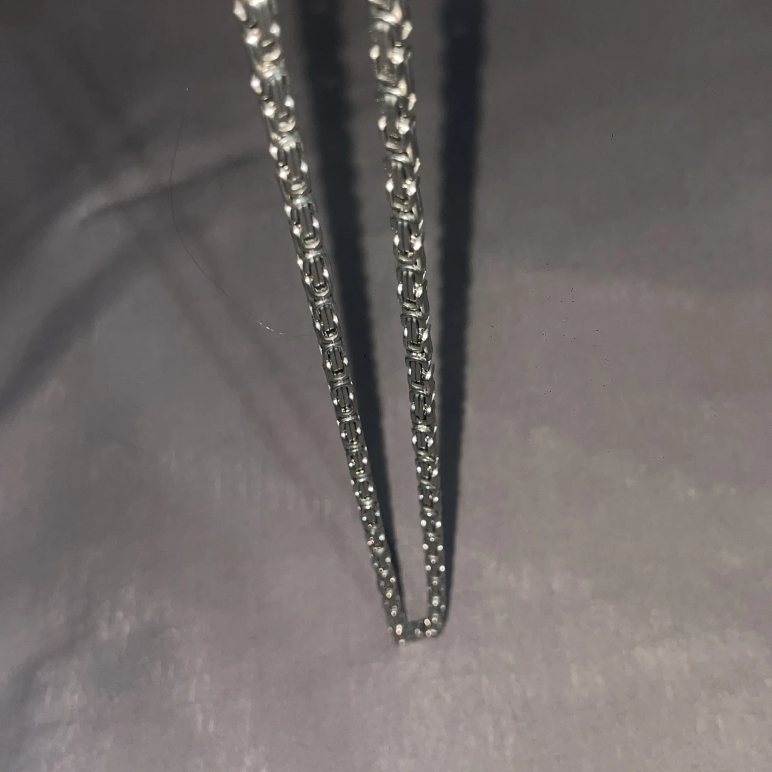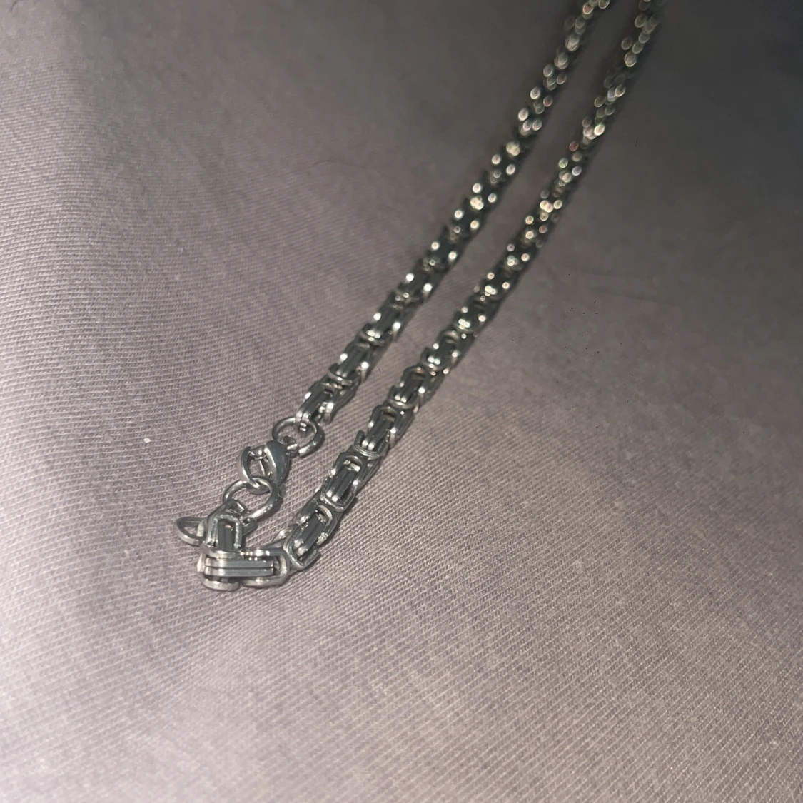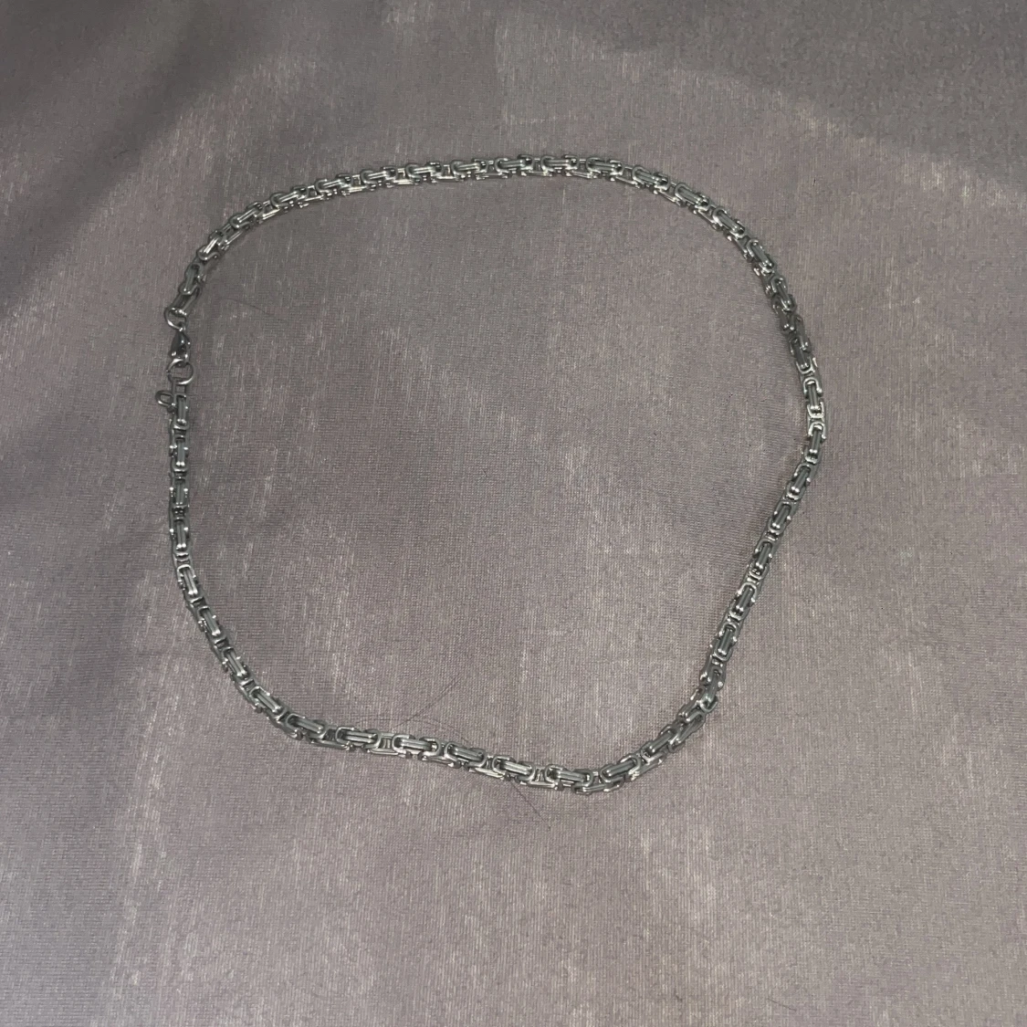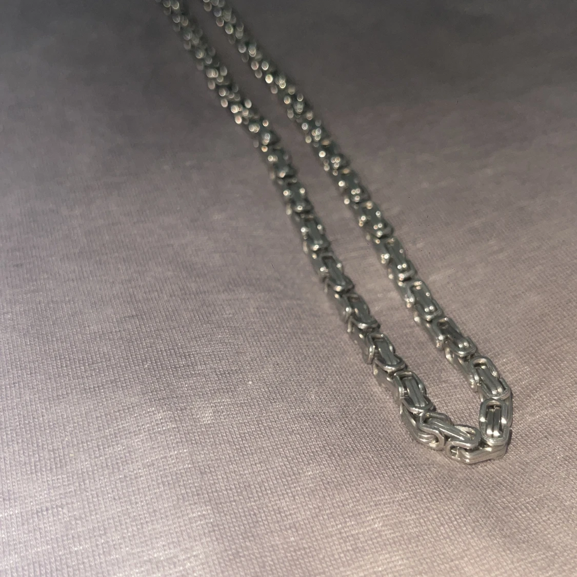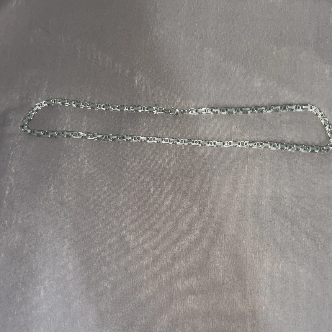 Stilrent halsband med robust kedjedesign i silverfärg. Länkarna är fyrkantiga och ger ett coolt, industriellt intryck. Perfekt för dig som gillar minimalistiska smycken med lite edge. Lås med klassisk karbinhake. Passar både ensam eller i lager med andra halsband.