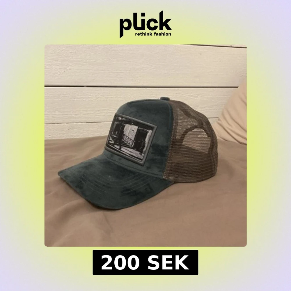 Snygg grön keps med brun nätpanel och justerbar rem baktill. Framtill finns en svartvit broderad patch med ett motiv. Perfekt för en avslappnad stil.