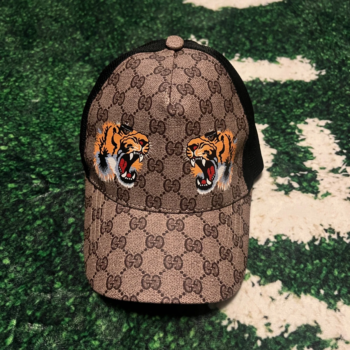 Snygg keps från klassiskt GG-mönster i beige och brunt. Framtill finns två broderade tigrar. Kepsen har svart mesh på sidorna och baksidan för extra ventilation. Perfekt accessoar för att sticka ut. Vid funderingar skriv!!! Vid snabb affär bättre pris