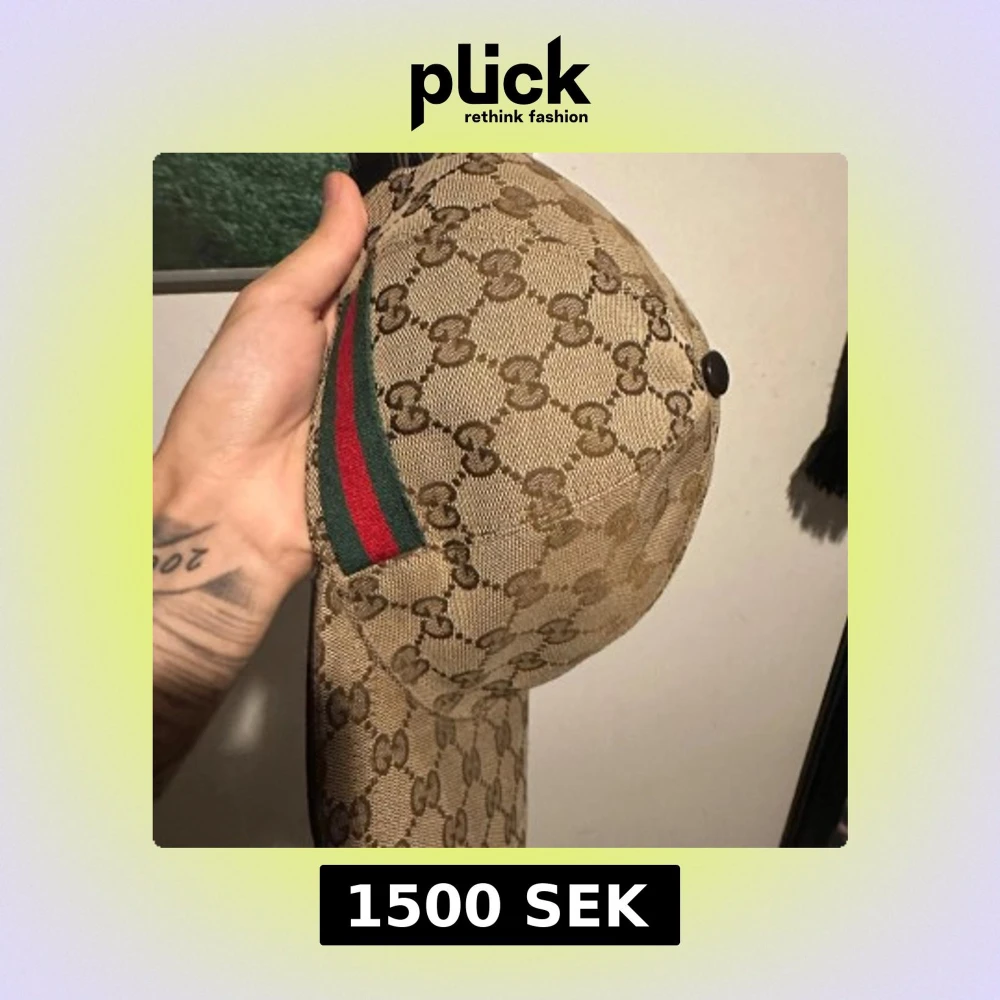 Snygg beige keps från Gucci med det ikoniska monogrammönstret. Kepsen har en justerbar rem i skinn baktill och en grön och röd randdetalj på sidan. Perfekt för att ge din outfit en lyxig touch.