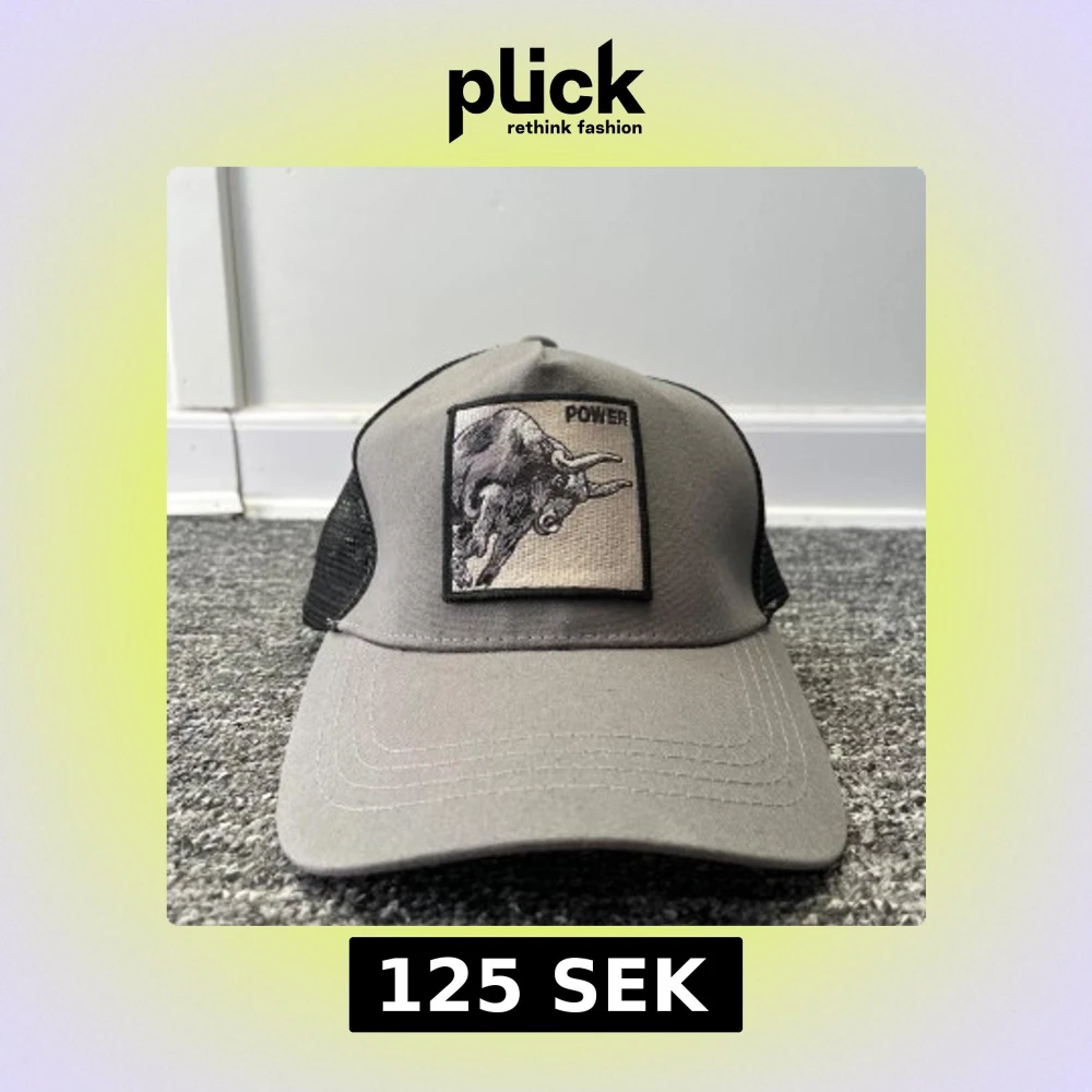 Snygg grå keps med ett coolt tjurmotiv och texten 'POWER' på framsidan. Kepsen har ett svart nät på baksidan för extra ventilation. Perfekt för en avslappnad stil.