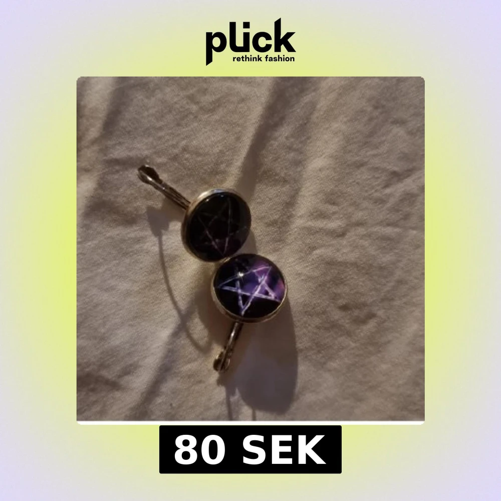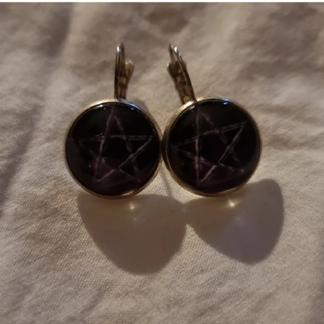 Coola runda örhängen med svart o lila bakgrund och ett vitt pentagram i mitten. Metallfärgade kanter och lås. Okänt material.