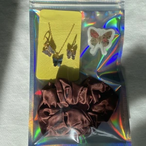 65kr och jag står för frakten☺️ innehåll: ett par brun/svarta fjärils örhängen och svart fjärils halsband, brun scrunchie, klistermärken