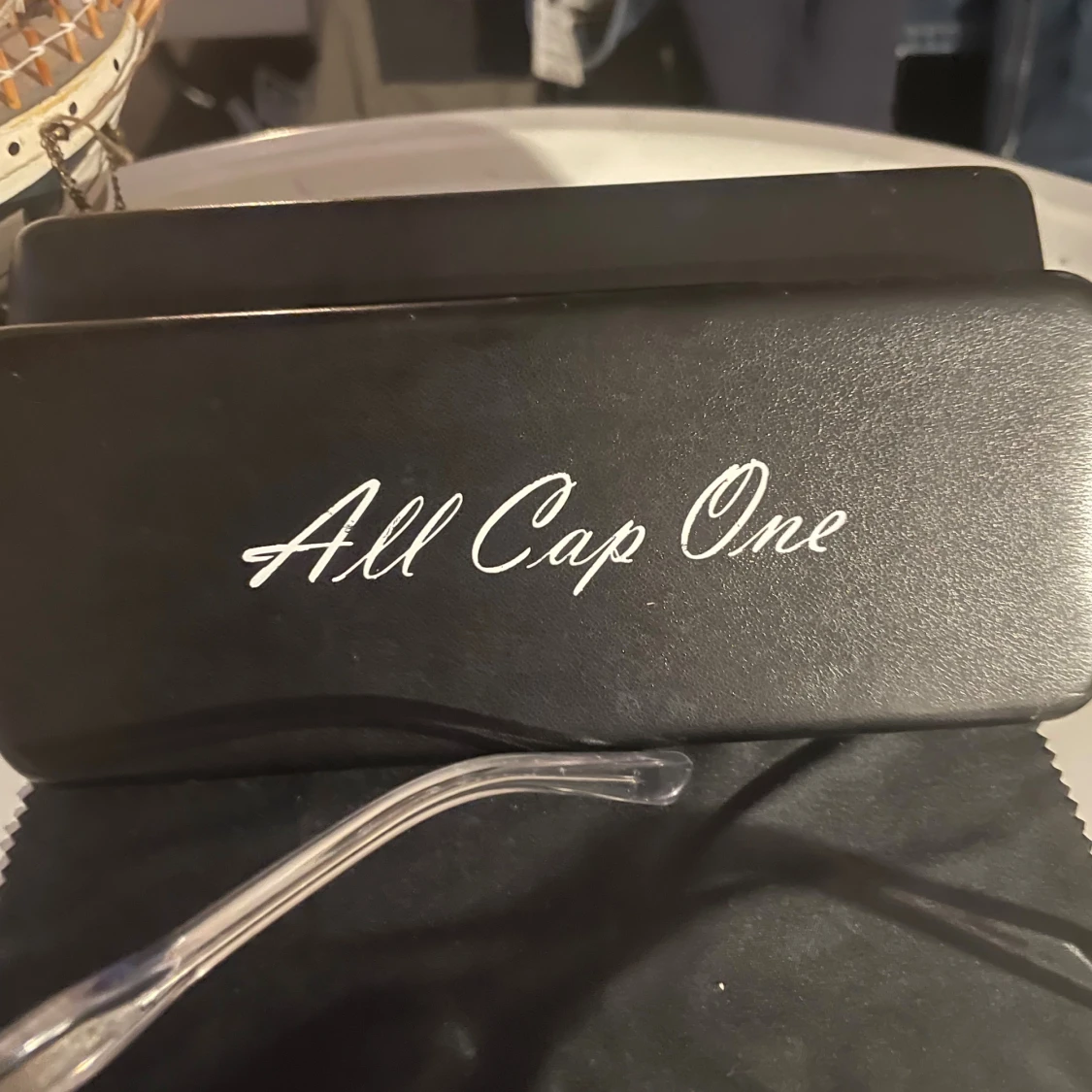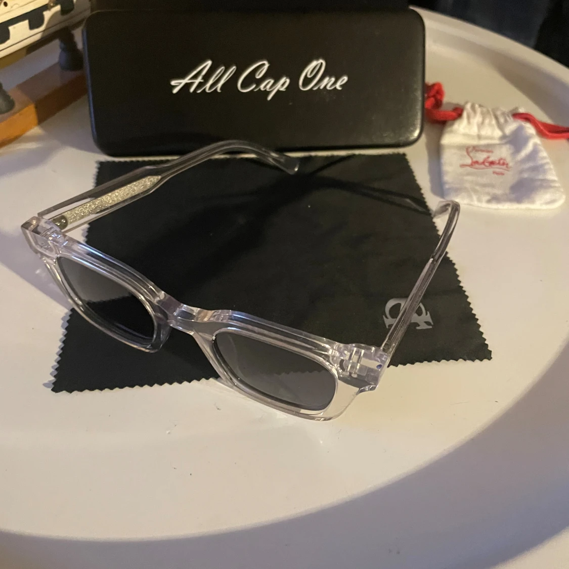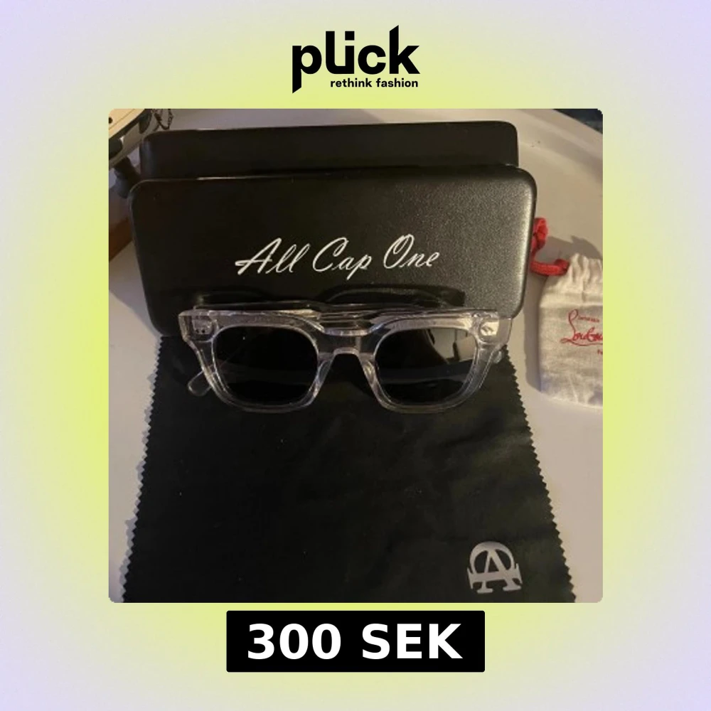 Säljer ett par stilrena solglasögon från All Cap One med transparent båge och svarta glas. Rektangulär form som ger en modern vibe. Kommer med originalfodral och putsduk med logga. Perfekt accessoar för att lyfta din look.