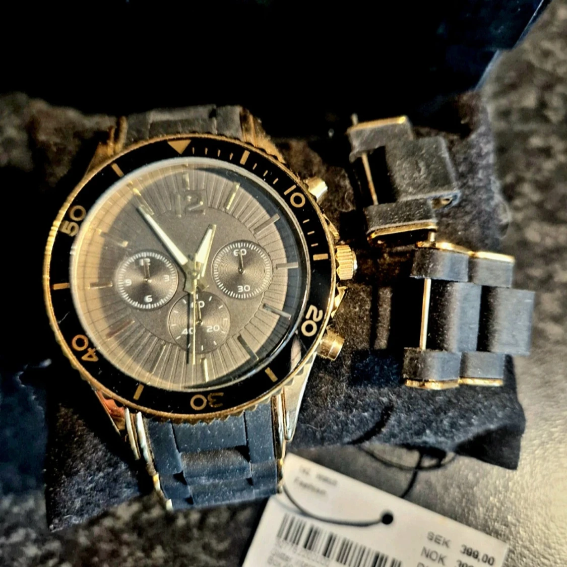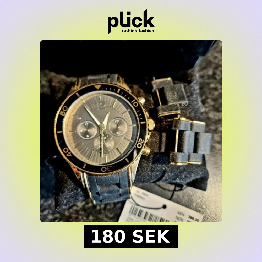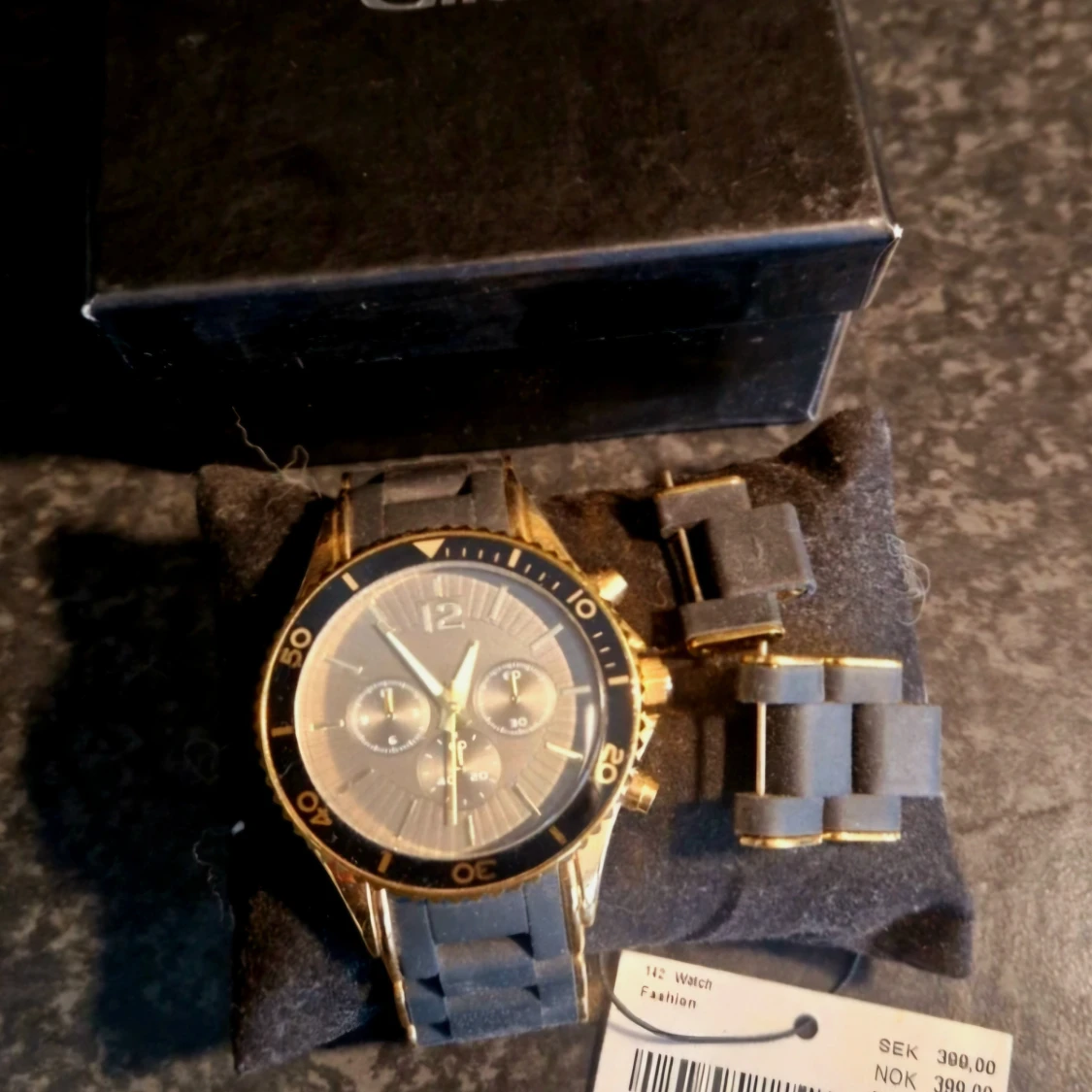 Klocka från Glitter i guld och svart. Nytt batteri behövs.