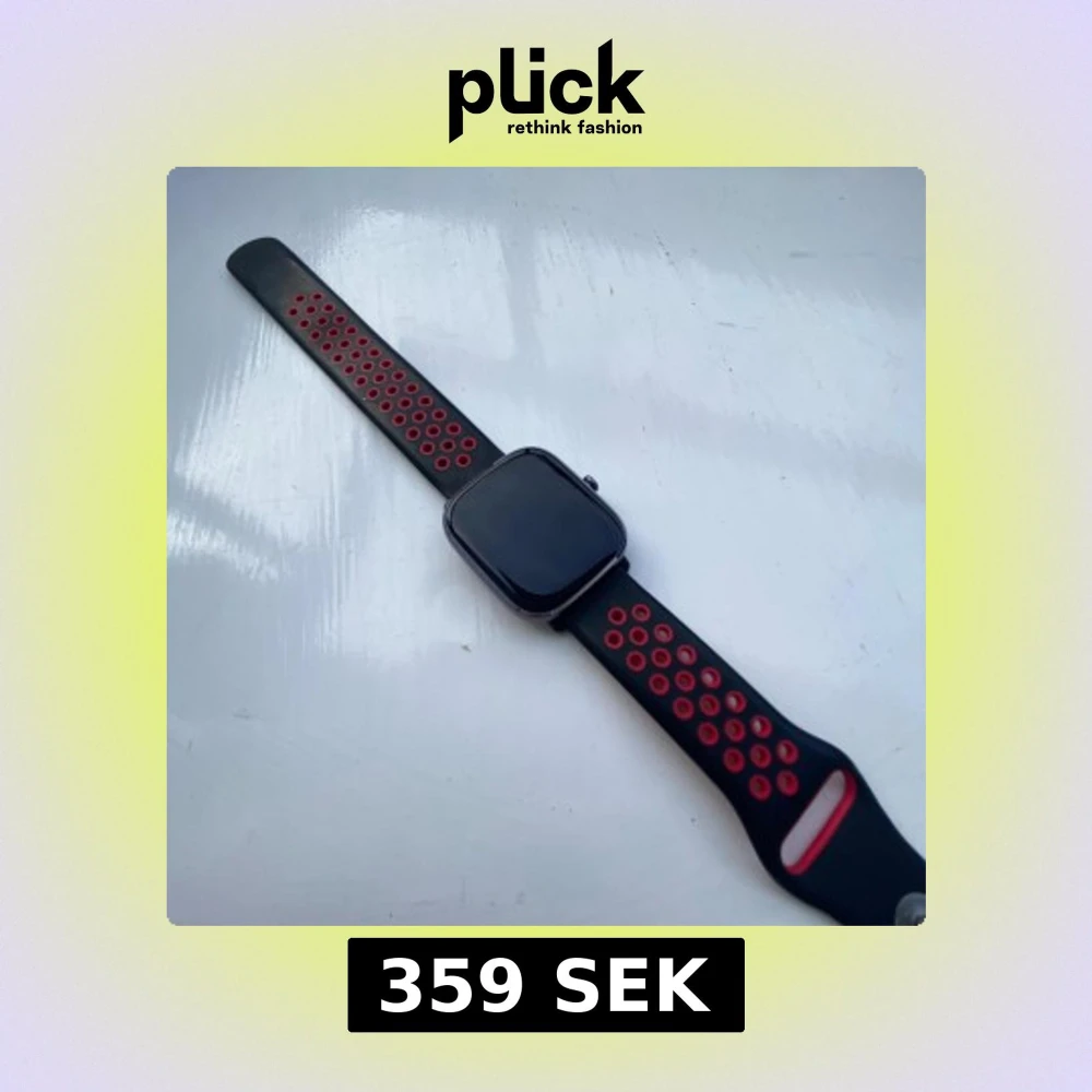 Säljer en Amazfit smartklocka med fyrkantig display och svart silikonarmband med röda prickar. Klockan har touchskärm, pulsmätare, aktivitetsmätning och medföljer laddkabel med USB. Perfekt för dig som gillar teknik och vill ha koll på träningen. PRISET KAN DISKUTERAS.