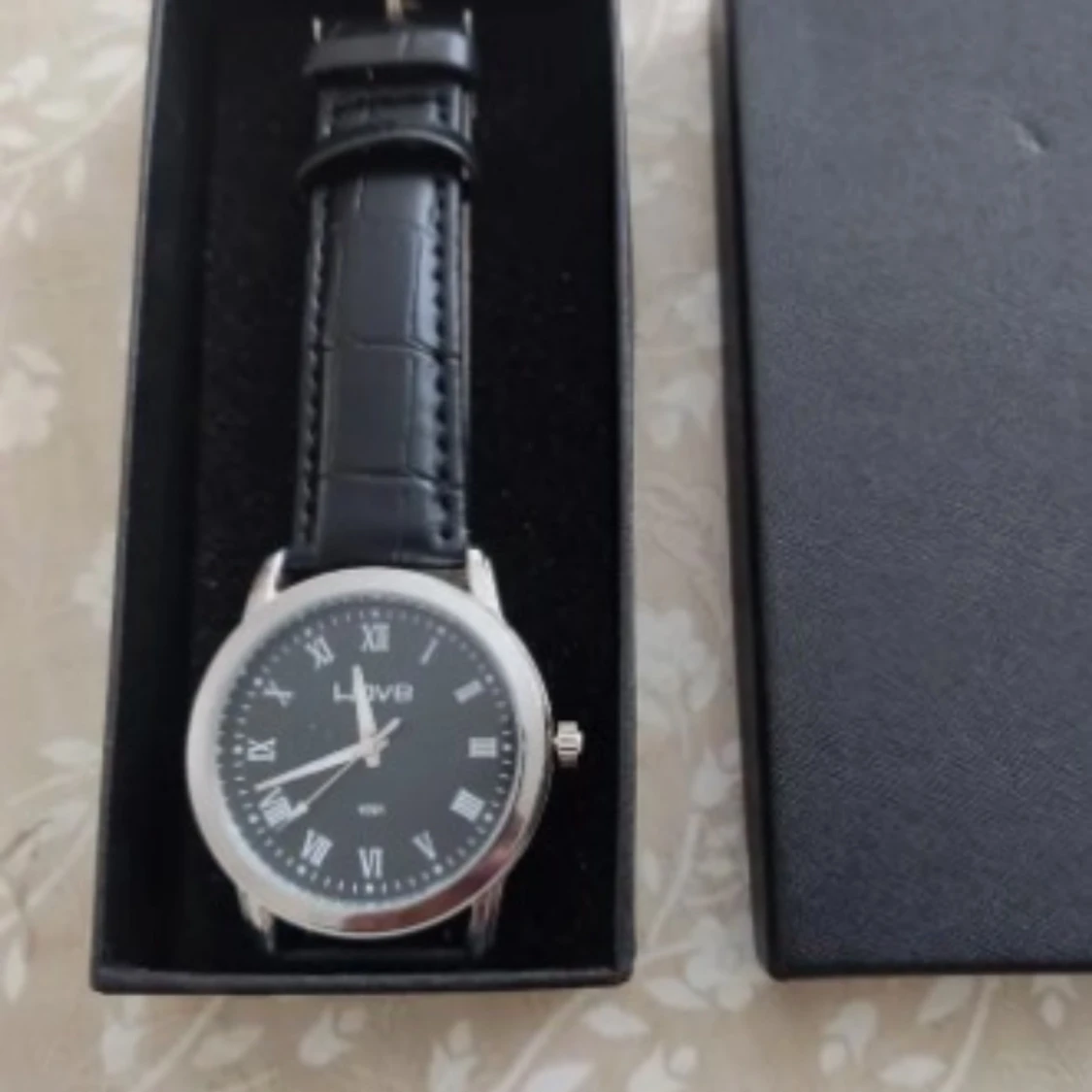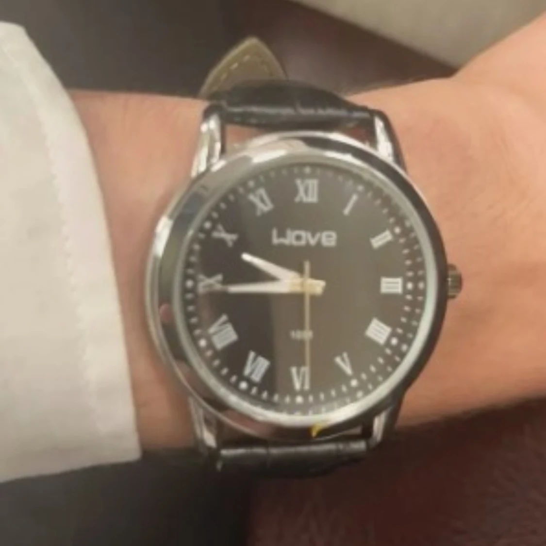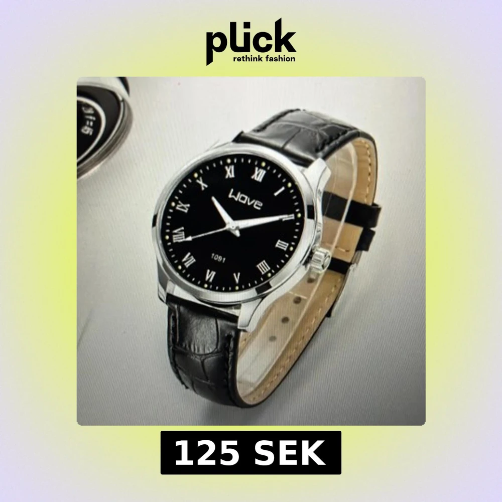 Stilren klocka från Wove med svart urtavla och romerska siffror i vitt. Boetten är i silverfärgad metall och armbandet är svart med läderlook och krokopräglat mönster. Klassisk design som passar till många stilar.