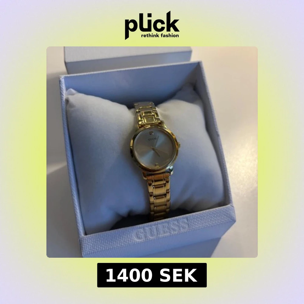 Guldfärgad klocka från Guess. Det tillkommer extra delar så det går att göra bandet större om det önskas (det går även att göra mindre)!!
