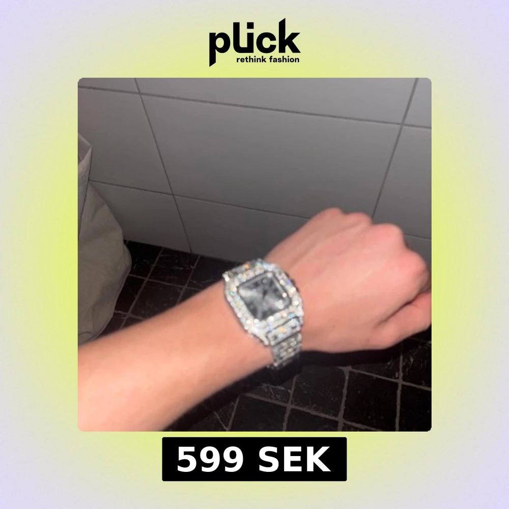 Säljer en glittrig klocka med fyrkantig urtavla och armband i silverfärg, täckt av gnistrande stenar. Klockan har en klassisk design med romerska siffror på urtavlan och passar perfekt som accessoar. Reservlänkar tillkommer.