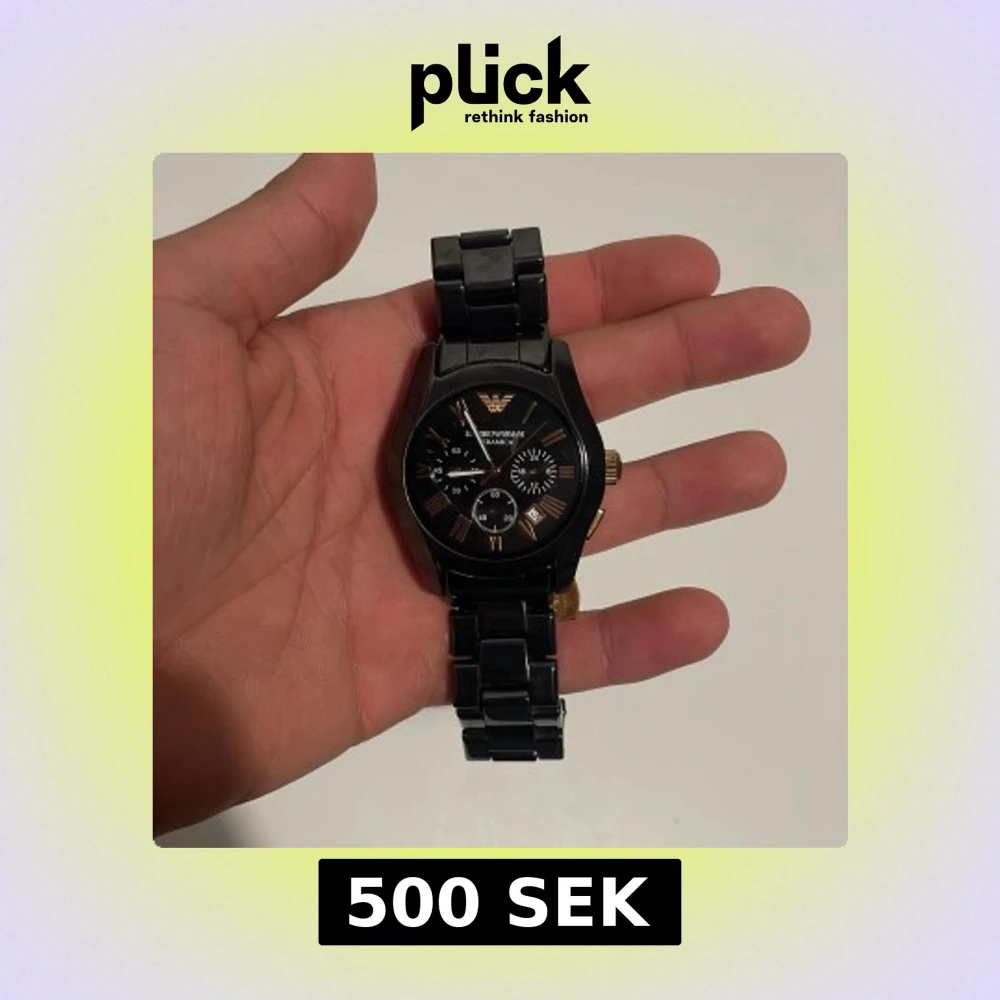 Snygg svart keramisk klocka från Emporio Armani med guldiga detaljer och länkarmband i stål. Urtavlan har flera små visare och romerska siffror i guld. Låset är också i guld och har märkets logga ingraverad. Perfekt för dig som gillar stilrena accessoarer. Har en bit som är borta men lätt att fixa och billig
