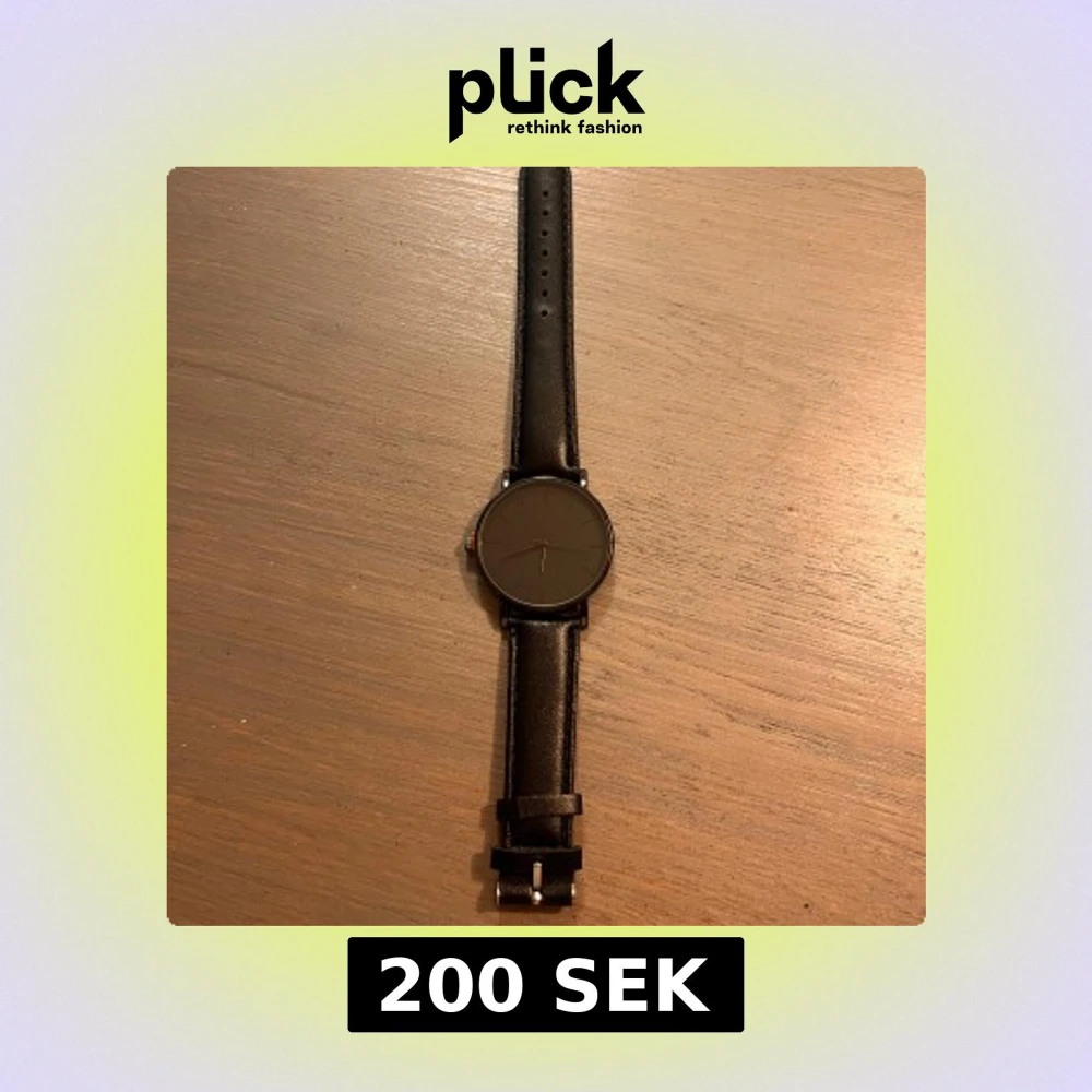 Stilren svart klocka med rund urtavla och svart läderband. Urtavlan är helt svart utan siffror och har tunna visare för en clean look. Perfekt accessoar för dig som gillar enkel och modern design.