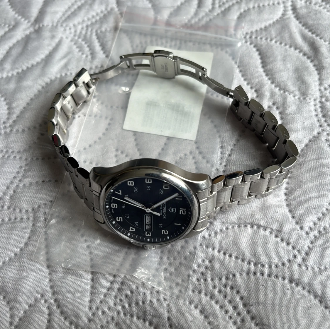 đŸ•°ïž Victorinox Swiss Army 241590 – Tidlös schweizisk precision i rostfritt stĂ„l Upplev kraften i schweizisk ingenjörskonst med denna Victorinox Swiss Army 241590, en stilren och robust herrklocka som kombinerar funktionalitet, kvalitet och design i vĂ€rldsklass. Tillverkad i rostfritt stĂ„l och med en tidlös, sportig estetik Ă€r detta en klocka som passar bĂ„de till vardags och vid mer formella tillfĂ€llen. Den Ă€r skapad för att tĂ„la tuffa tag, men ser samtidigt elegant ut pĂ„ handleden. OBS ingen box