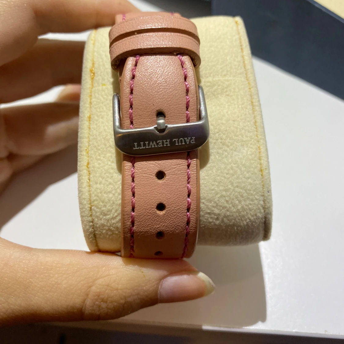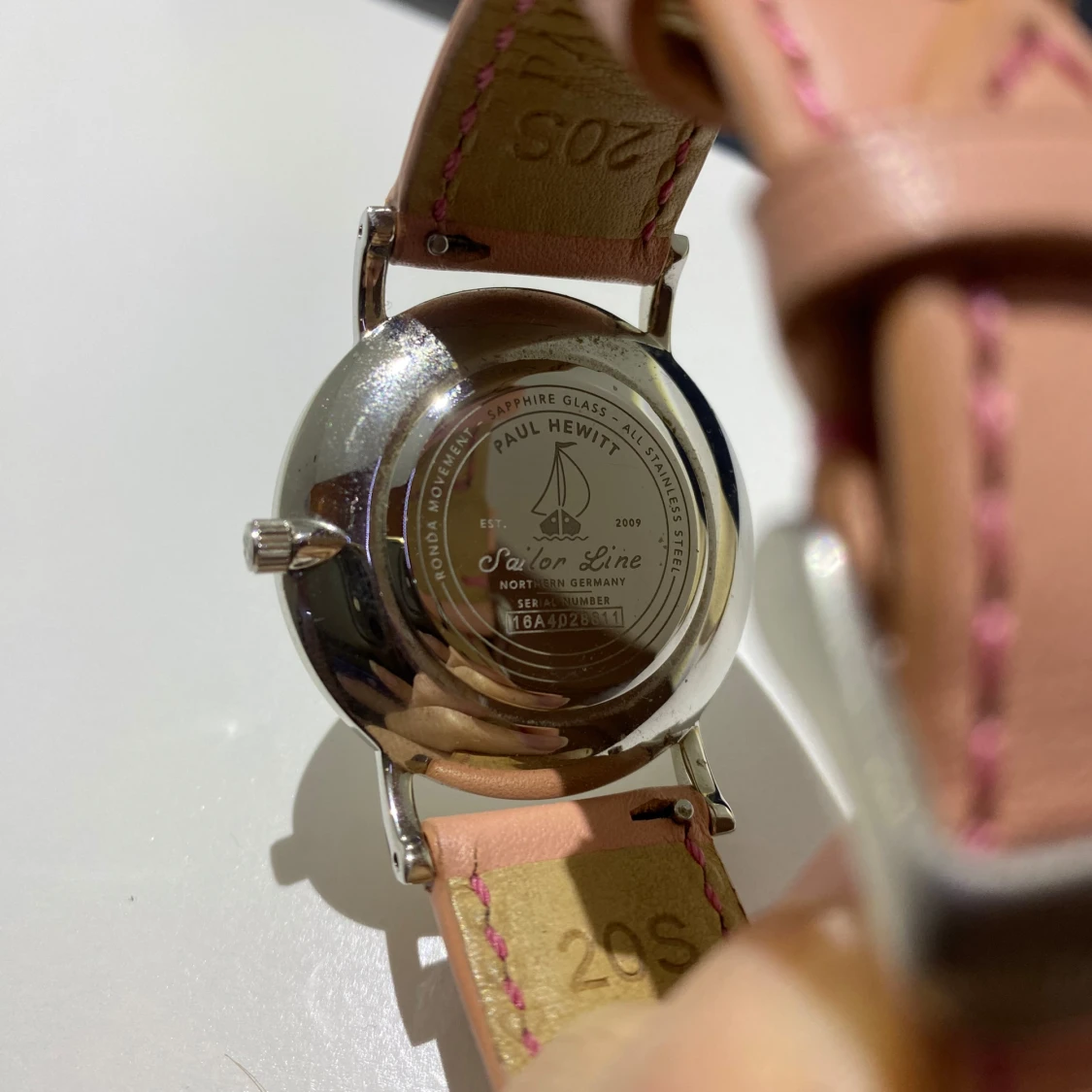 Säljer en stilren klocka från Paul Hewitt med en klassisk vit urtavla och romerska siffror. Klockan har en snygg rosa läderrem med rosa sömmar, vilket ger den en modern touch. Tillverkad i Tyskland och en del av deras Sailor Line. Perfekt för både vardag och fest!