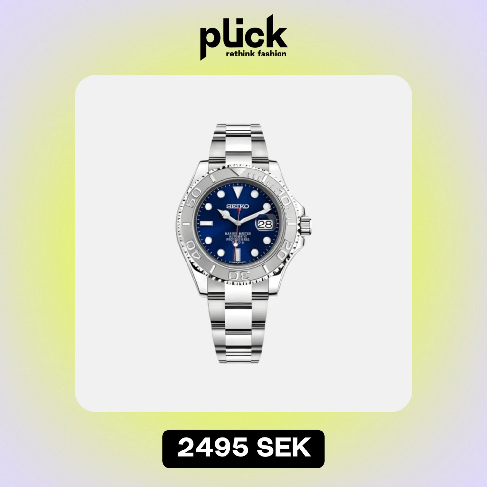 Seiko Yacht-Master med blått gummiarmband - Snygg Seiko Yacht-Master med svart urtavla, silverfärgad vridring och blått gummiarmband och även en oyster silver band till. Klockan har tydliga index, datumfönster och sportig känsla. Perfekt för dig som gillar exklusiva accessoarer med modern touch.