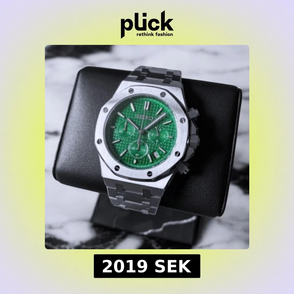 Snygg Seiko kronograf med grön, texturerad urtavla och silverfärgat armband i metall. Klockan har en oktagonal boett med synliga skruvar, datumvisning och flera subdials. Perfekt för dig som gillar sportig och modern design med coola detaljer.