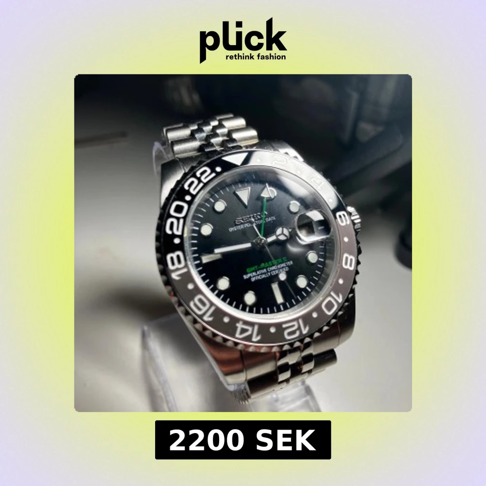 Seiko GMT med jubilee länkar. Caseback i glas (så man ser urverket), automatiskt NH35 urverk. Klockan är byggd med delar i hög kvalité och är vattentät.