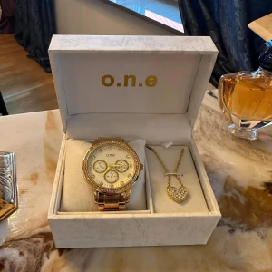 Guldig Klocka med Hjärt halsband från märket O.N.E, köpt från Guldfynd. Aldrig använd. I originalskick. Klockan är justerbar från handled till handled. Otroligt snyggt. Perfekt som en gåva. För bara 300kr.