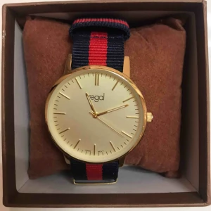 En guld regal klocka med ett röd och blå band. I bra skick, nästan som ny och har batteri som håller i 2 år. Org pris: 1050kr Vi kan träffas om du bor i Gävle