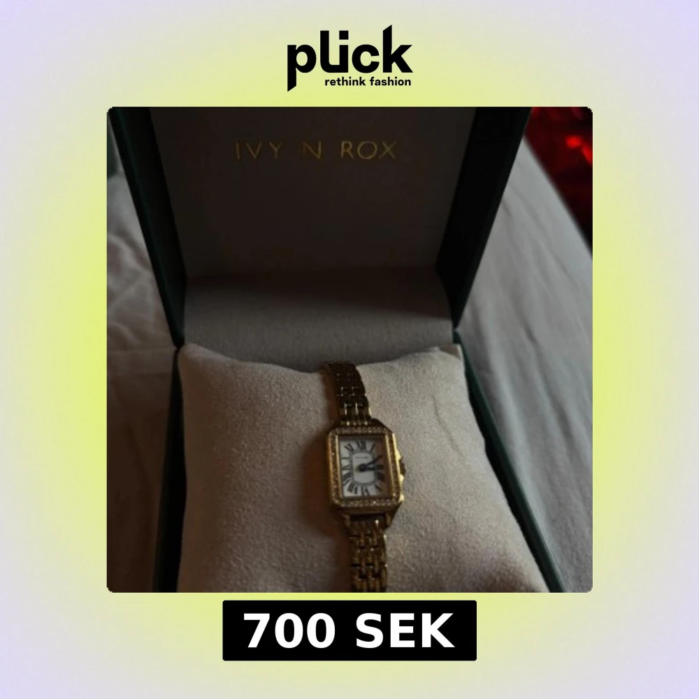 Elegant guldfärgad klocka från Ivy N Rox med rektangulär urtavla och romerska siffror. Klockan har en länkarmband i guld och en klassisk design som passar perfekt för en stilren look.