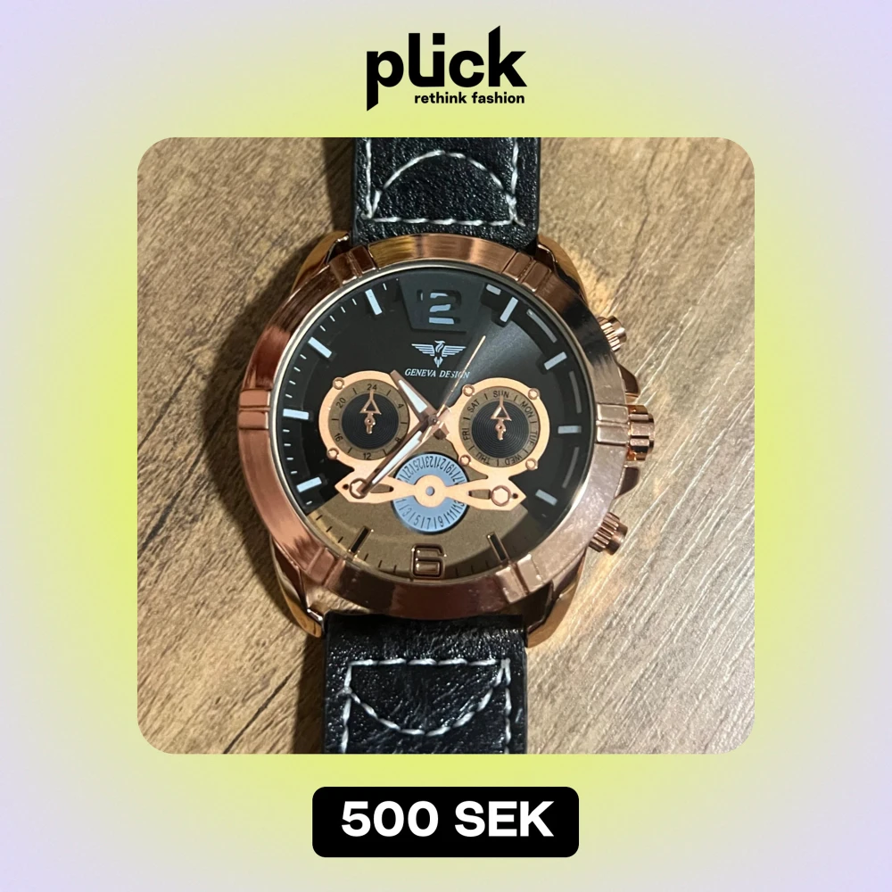 Säljer en snygg klocka från Geneva Design med svart urtavla och roséguldfärgad boett. Klockan har en svart läderrem med vita sömmar som ger en cool kontrast. Perfekt för både vardag och fest! 🕒✨