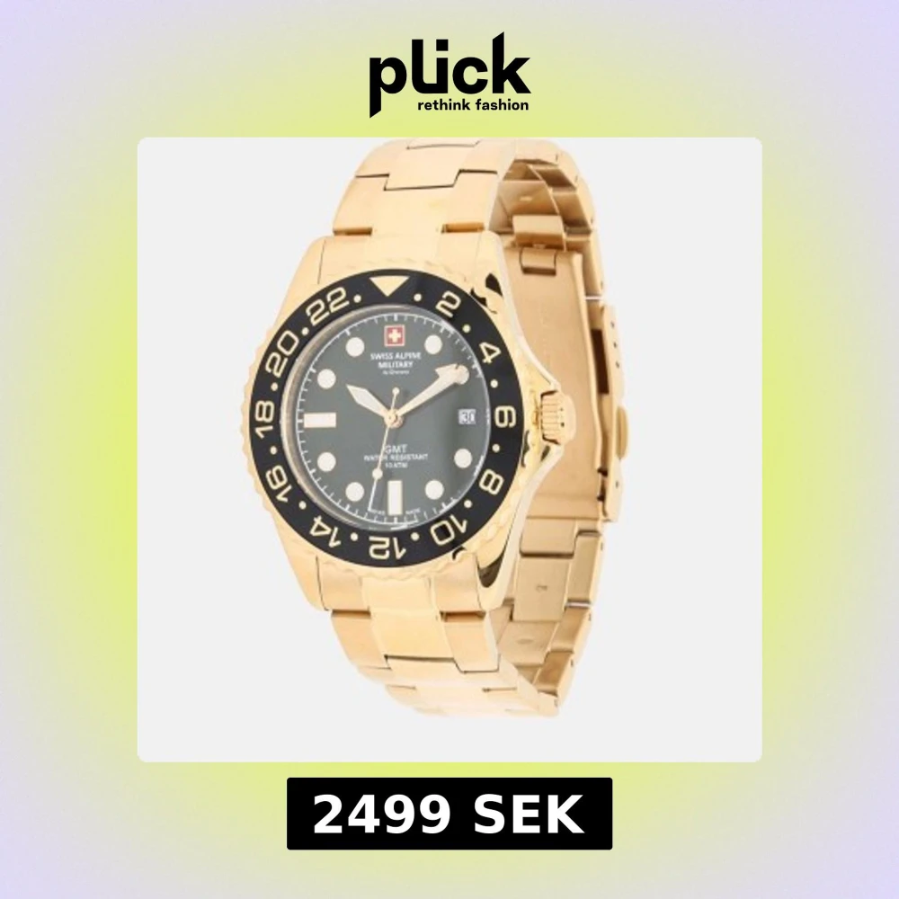 Stilren herrklocka i guldfärgat metallarmband och svart urtavla. Klockan har tydliga siffror, datumvisning och vridbar bezel. Levereras i originalask med Swiss Alpine-logga.