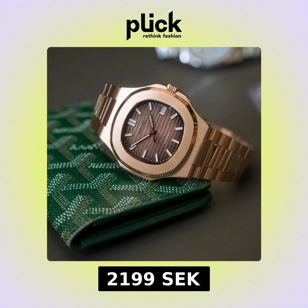 Snygg Seiko automatisk klocka i roséguld med länkarmband och brunt urtavla med diskreta ränder. Urtavlan har datumvisning och tydliga indexmarkeringar. Klockan har en modern, lyxig känsla och passar perfekt för dig som gillar stilrena accessoarer.