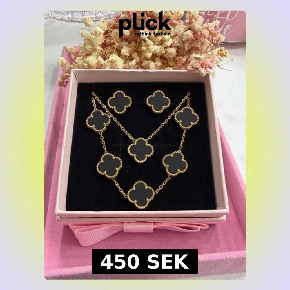 Elegant och stilrent klöver-set i vacker svart färg som ger en lyxig och trendig känsla. Setet består av halsband, armband och örhängen, tillverkat i högkvalitativt rostfritt stål med exklusiv 18K guldplätering. Klöverdesignen i 15 mm ger ett tidlöst och feminint uttryck som passar både vardag och fest. Armbandet har en längd på 17,5 cm till första ringen samt 5 cm förlängningskedja för optimal och justerbar passform. Setet levereras i en elegant ask, perfekt som present.