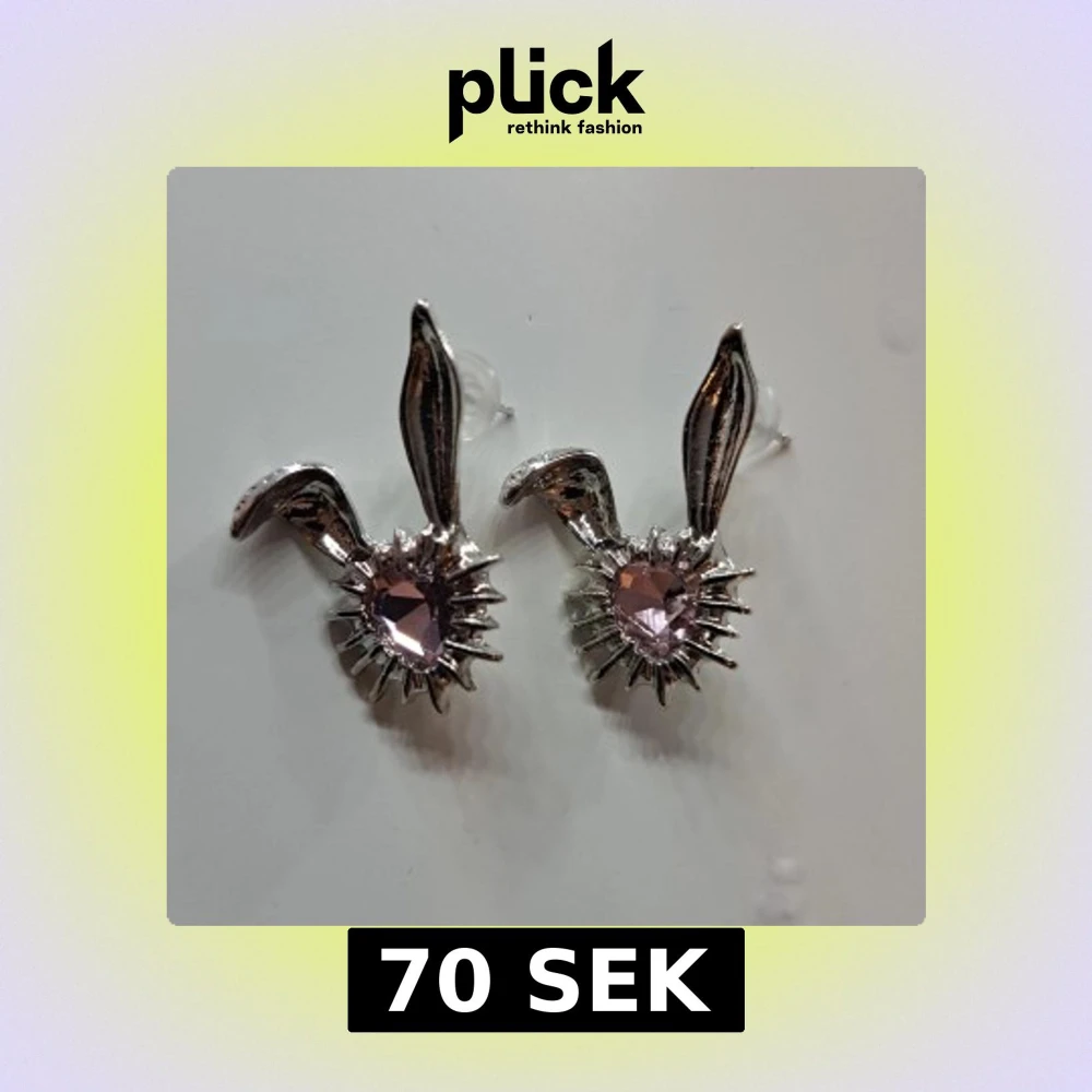 Unika silvriga örhängen med en design som påminner om kaninöron. De har en vacker rosa sten i mitten som ger en glittrig effekt. Perfekta för att lägga till en lekfull touch till din stil. PRISET KAN DISKUTERAS