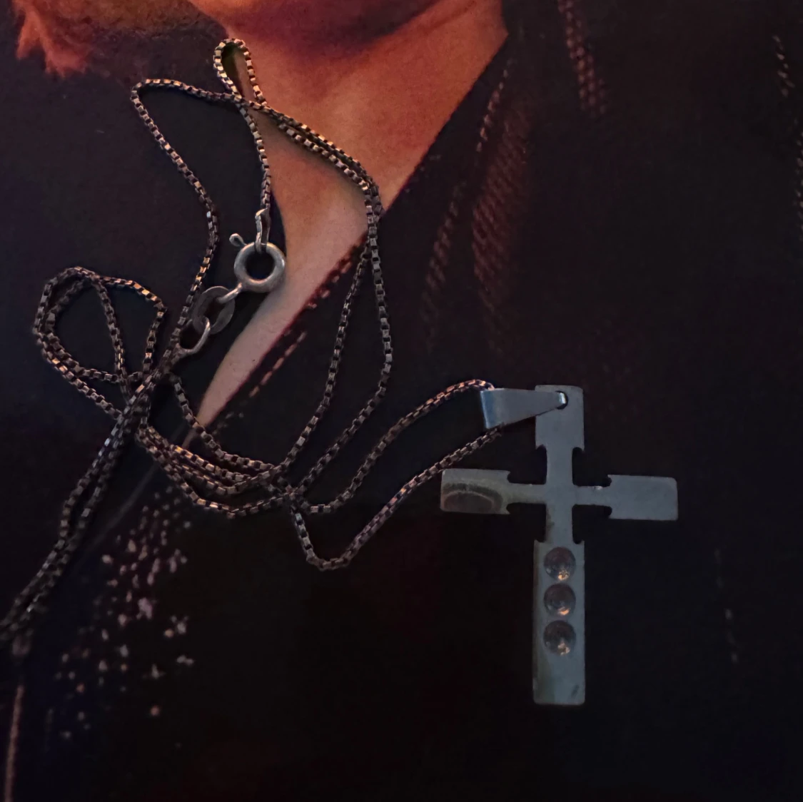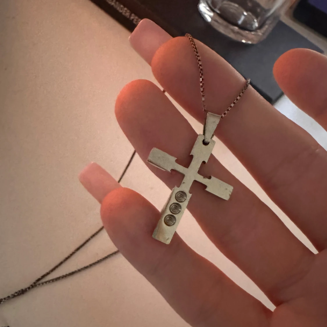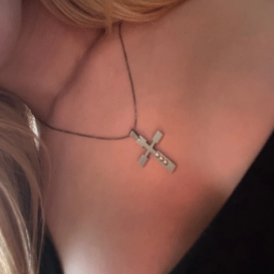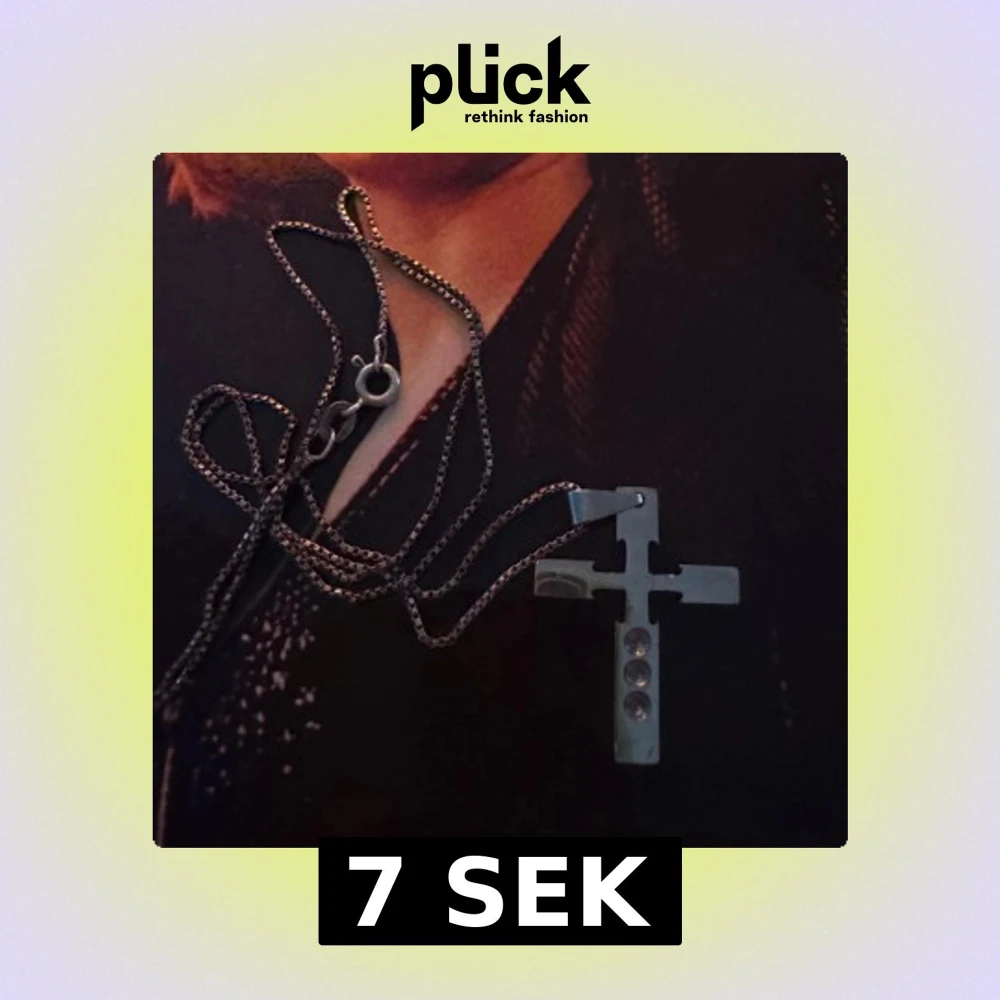 Stilrent halsband i silverfärg med ett korsformat hänge. Hänget har tre infällda håll som ger extra. Kedjan är tunn och boxlänkad, perfekt för dig som gillar minimalistiska smycken med en cool touch.