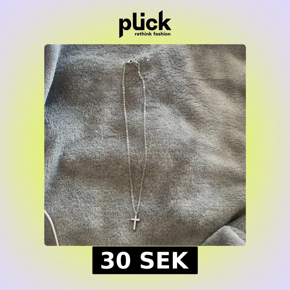 Silvrigt halsband med kors. Korset har stenar. Aldrig använd och är i nytt skick.