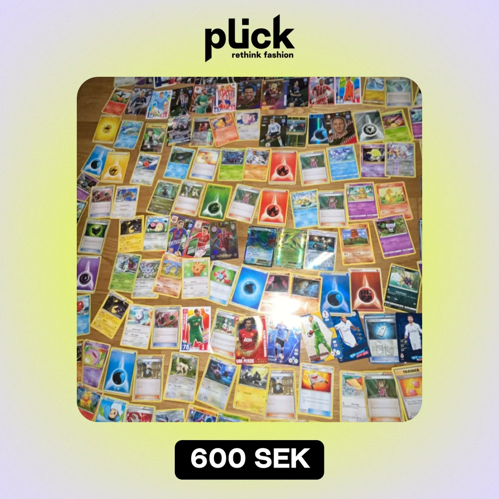 En samling av olika samlarkort, inklusive Pokémon-kort med energikort och karaktärer i olika färger och teman. Det finns också fotbollskort med spelare i olika lagdräkter. Perfekt för samlare eller spelentusiaster! Kontakta privat priset kan diskuteras