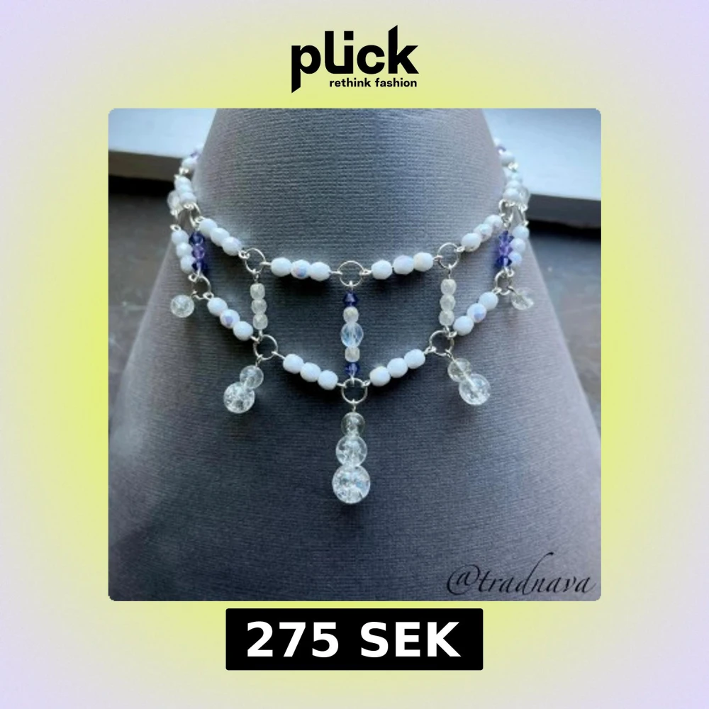 Handgjort halsband med vita firepolish-pärlor i färgen ”Chalk AB” (AB står för Aurora Borealis vilket är en ytbehandling på pärlorna som ger ett fint lyster när de träffas av ljus). Halsbandet är även smyckat med krackelerade glaspärlor och glaskristaller från Preciosa. Länkarna är i silverpläterad och non-tarnishbehandlad koppartråd🌿
