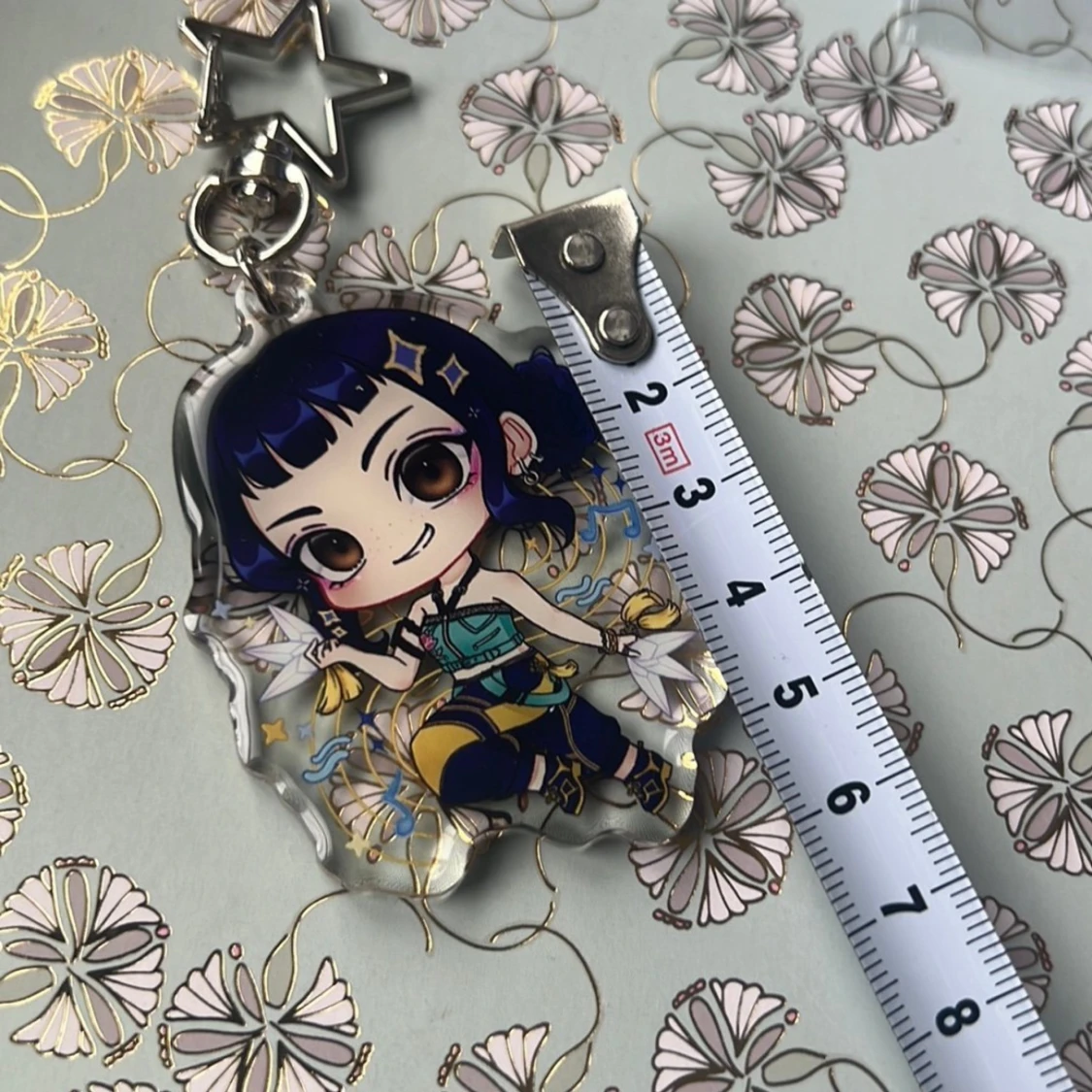Keychain of Zoey from Kpop demon hunters! Perfect for your bag decorations or collection :) With resin on both sides making it look extra glossy!