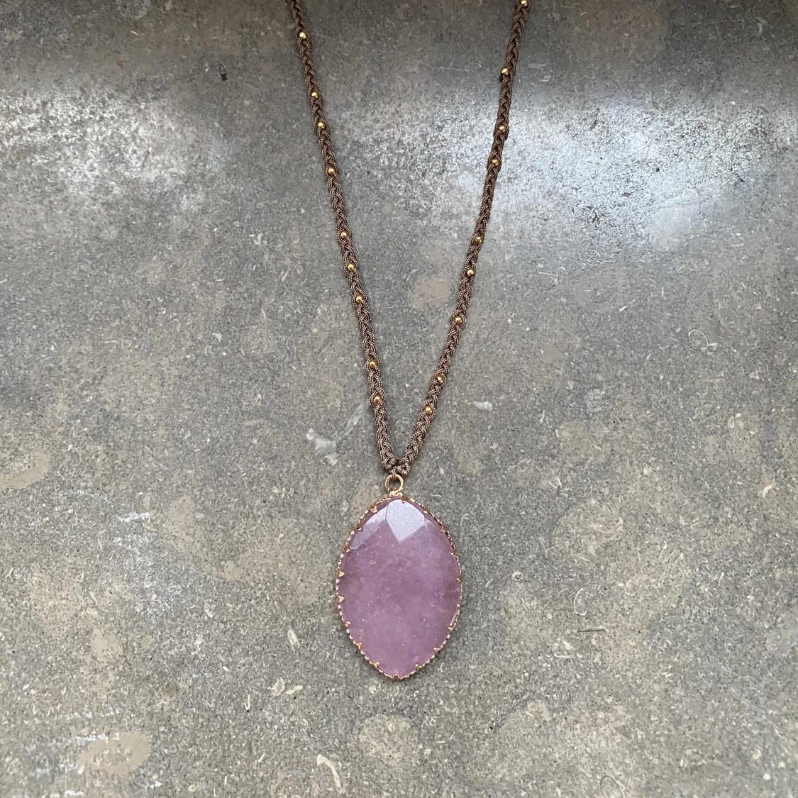 Halsband med jordgubbskvarts hänge och flätad kedja med guldfärgade pärlor
