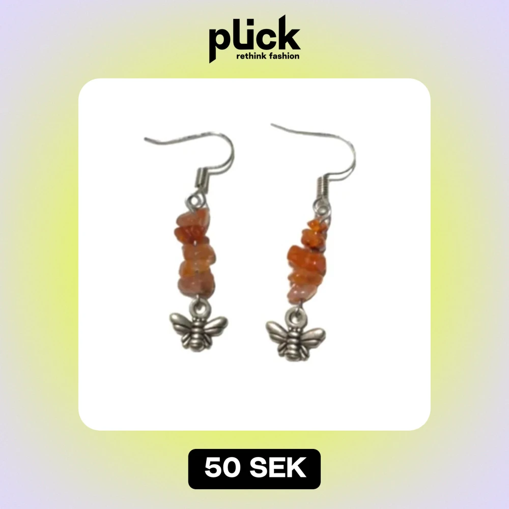 fina nickelfria orangea kristallörhängen med ett gulligt bi-berlock 🩷 tror stenen kallas för ”karnallit” 🤍