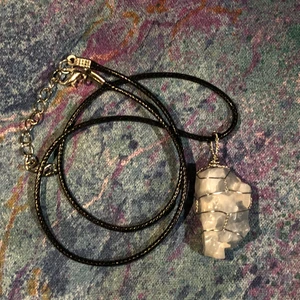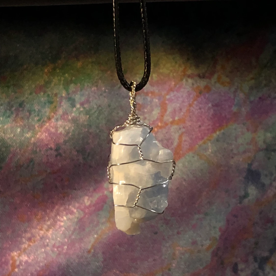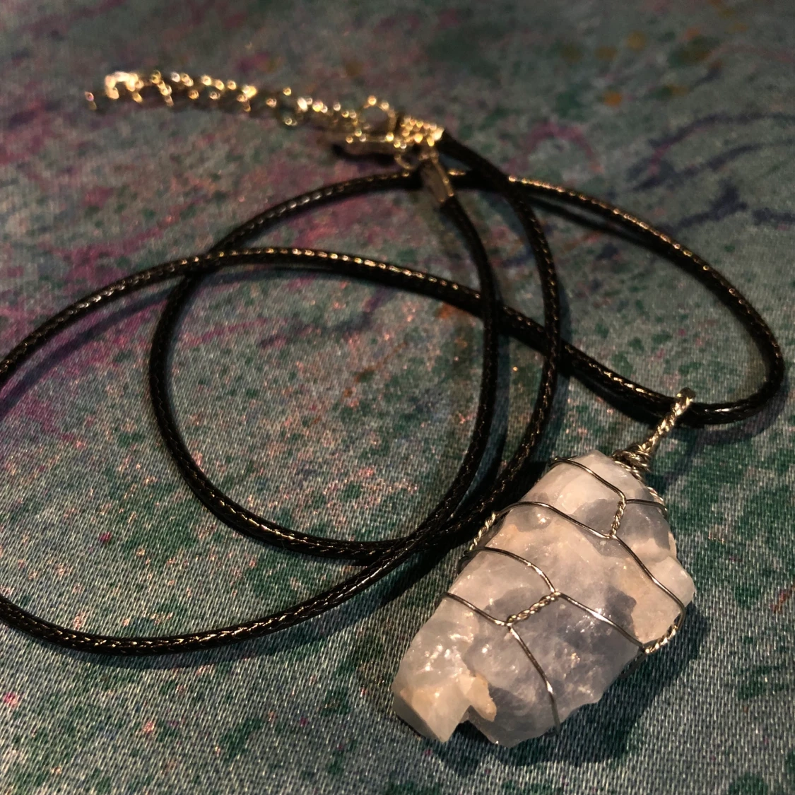 Ett snyggt hängsmycke i silverpläterad koppar tråd. Kristallen är blå kalcit. Kedjan ingår och frakten står köparen för:) Handgjord med kärlek!!:)
