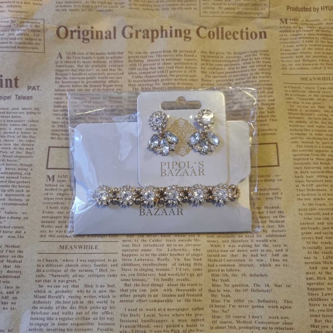Inplastat. Ett set med ett lyxigt armband och glittriga stiftörhängen från Pipols Bazaar. Örhängena är ca 2*3cm, armbandet är elastiskt och är ca 1,5cm brett. Allergitestade och nickelfria.
