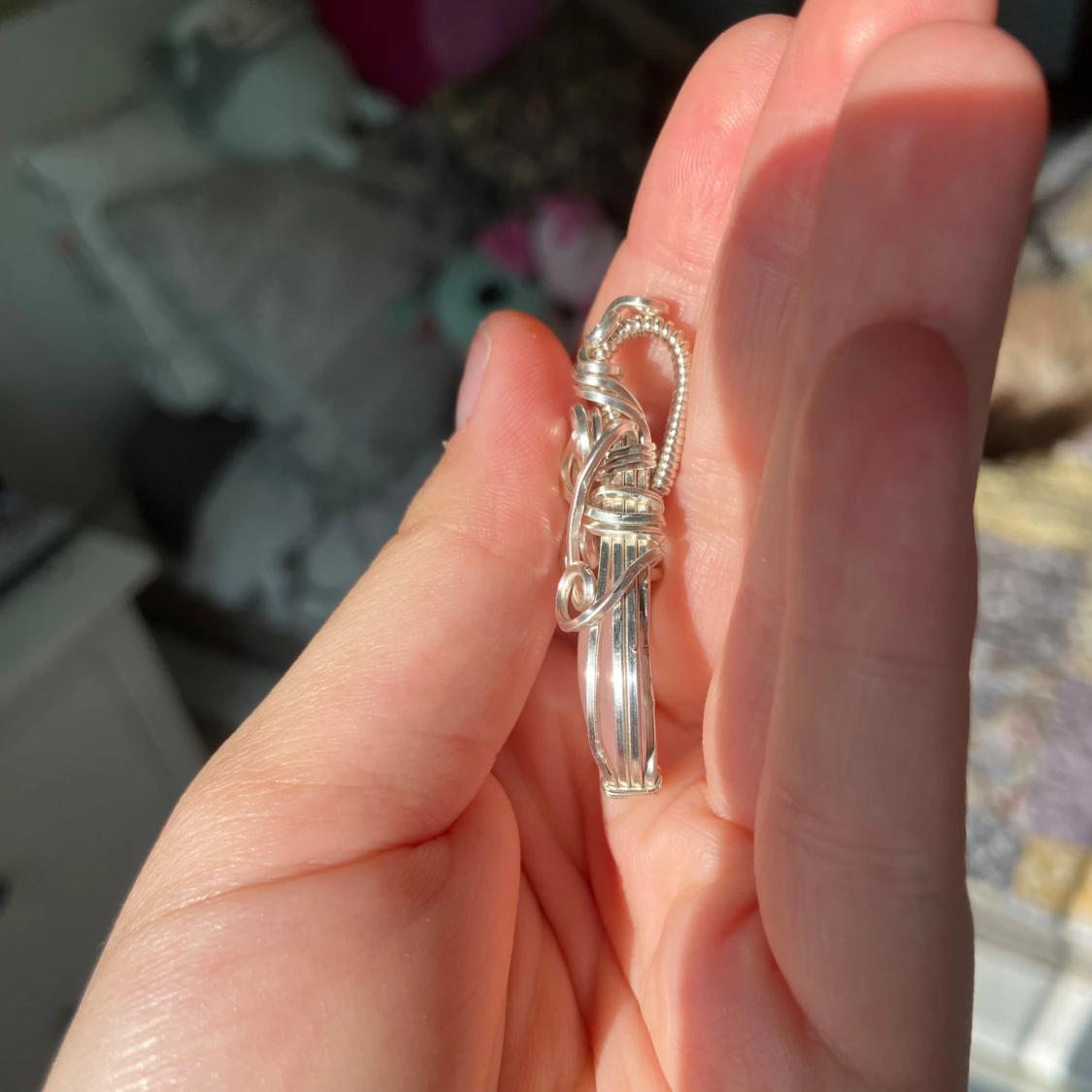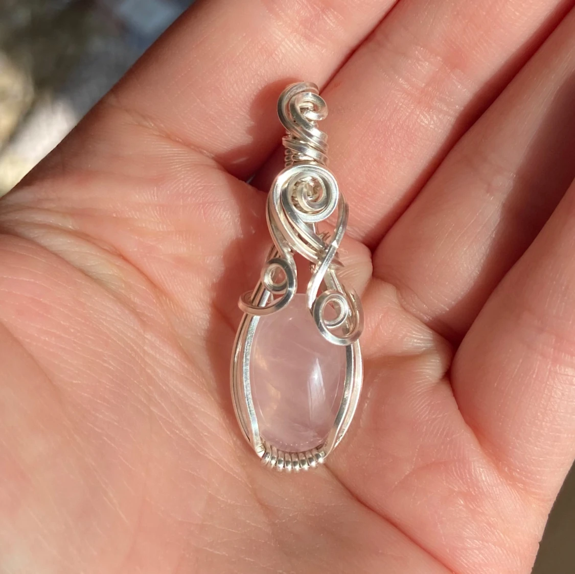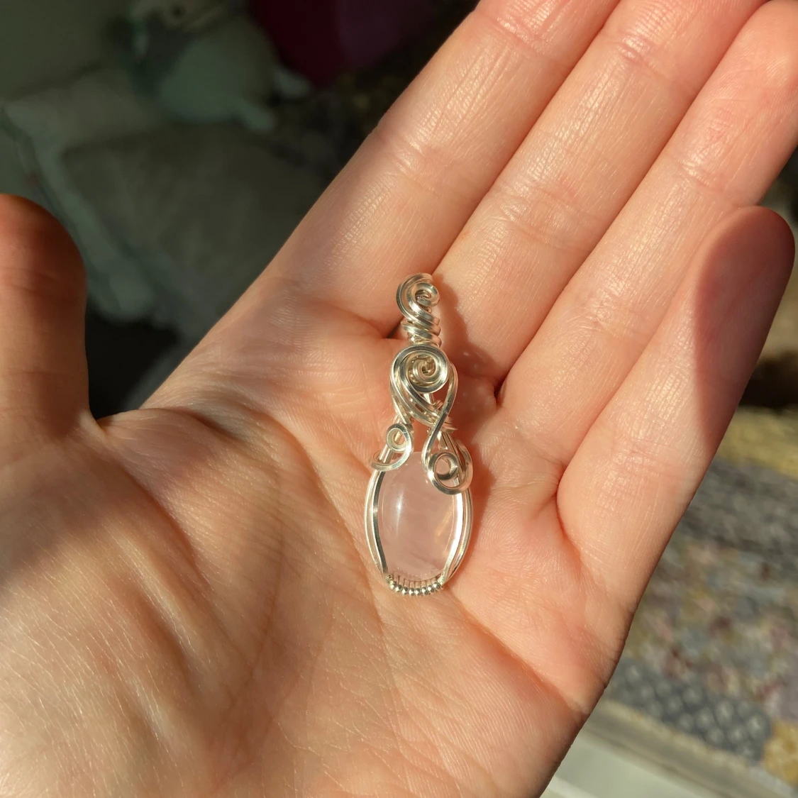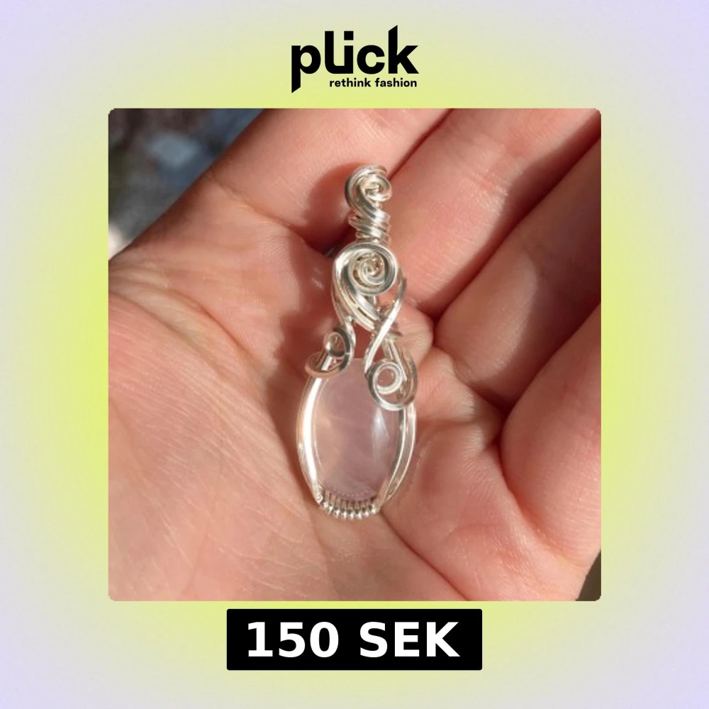 Unik berlock med en oval, ljusrosa kristall infattad i silverfärgad tråd som är snirkligt lindad runt stenen. Hängsmycket har coola spiraldetaljer och en elegant, bohemisk vibe. Perfekt för dig som gillar kristaller och vill sticka ut med något personligt.