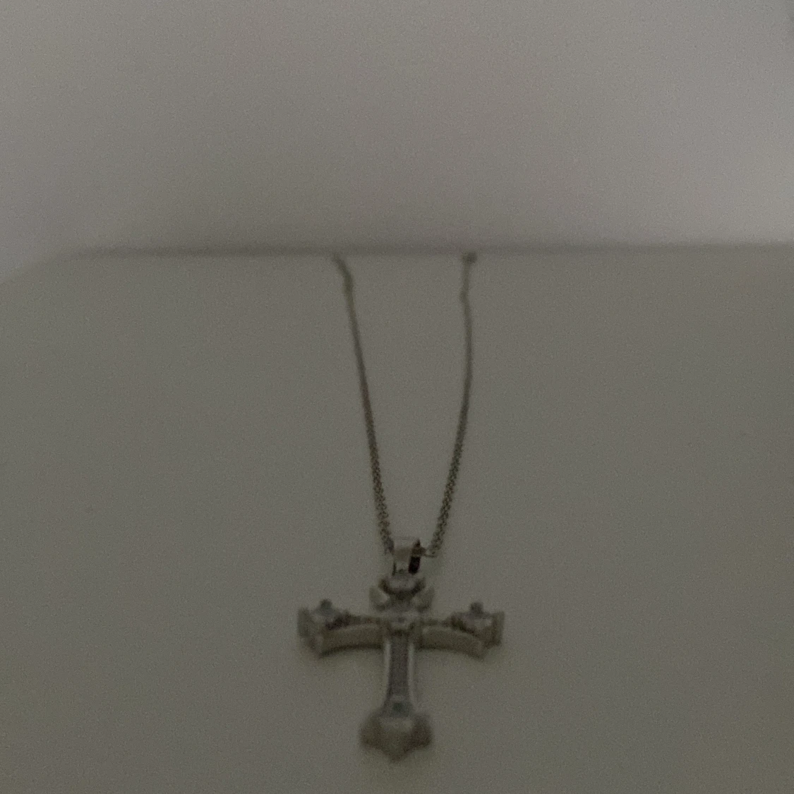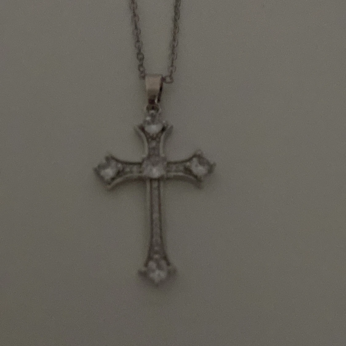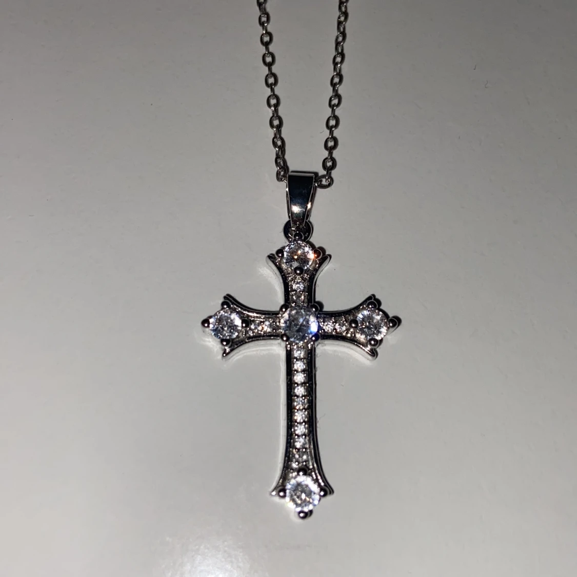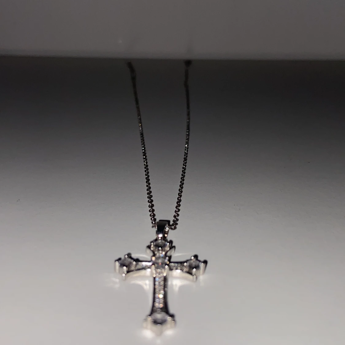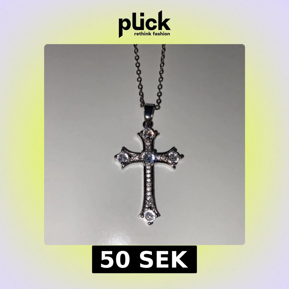 Snyggt halsband med ett korsformat hänge i silverfärg, dekorerat med gnistrande stenar längs hela korset. Kedjan är tunn och stilren, perfekt för att ge en extra touch till din outfit. ‼️OBS, ”Kristallerna” är ej äkta och finns endast för dekoration och touch så att du vet vid köp ‼️