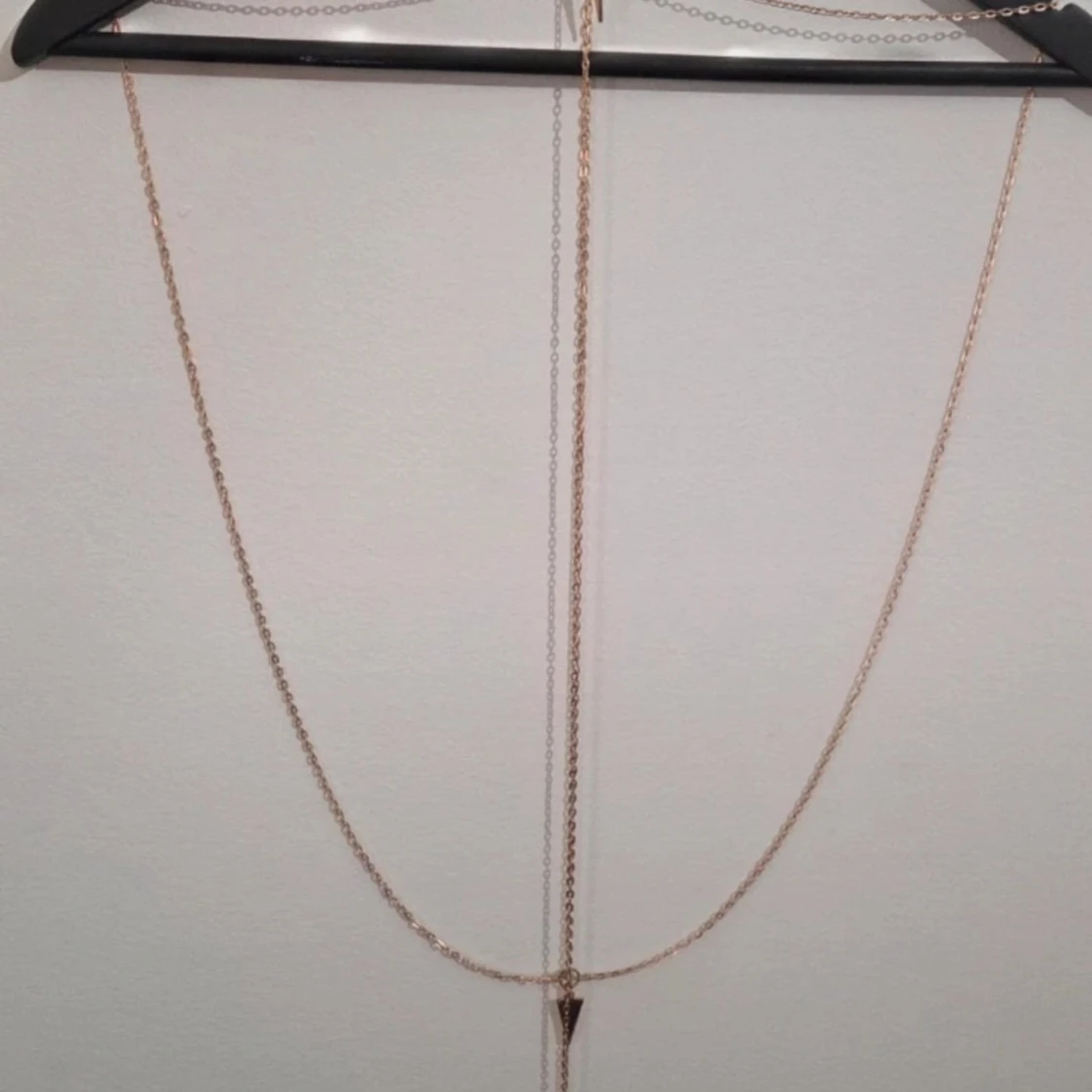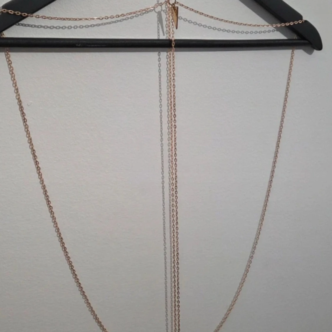 Ett vackert och glänsande kroppssmycke i guldfärgad metall. Smycket består av flera tunna kedjor som pryder halsen och överkroppen. Det är en perfekt accessoar för att lyfta en outfit, och kan bäras över en bikini, en crop top eller en enkel klänning. Den bohemiska stilen gör den idealisk för fest och festival. Har för mig att jag har köpt den på Bubbelroom eller Nelly. Längd: 68 cm
