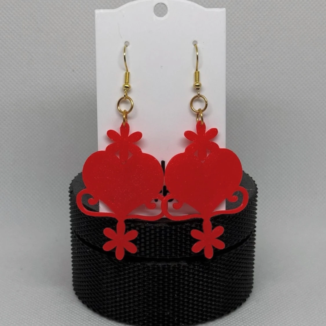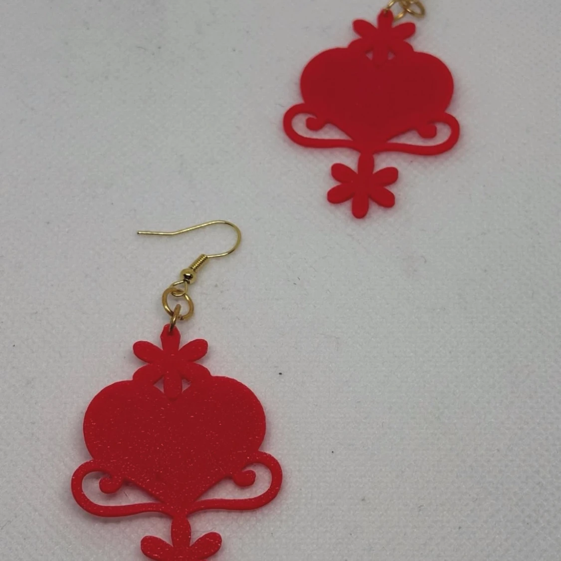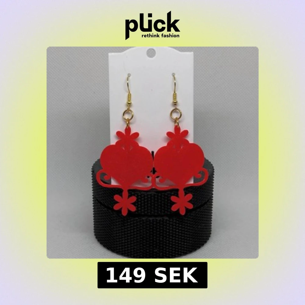 Snygga röda örhängen i hjärtform med dekorativa detaljer. Egen design med inspiration av kurbits. De har en glittrig yta och hängs upp med guldfärgade krokar. Perfekta för att ge en färgklick till din outfit.