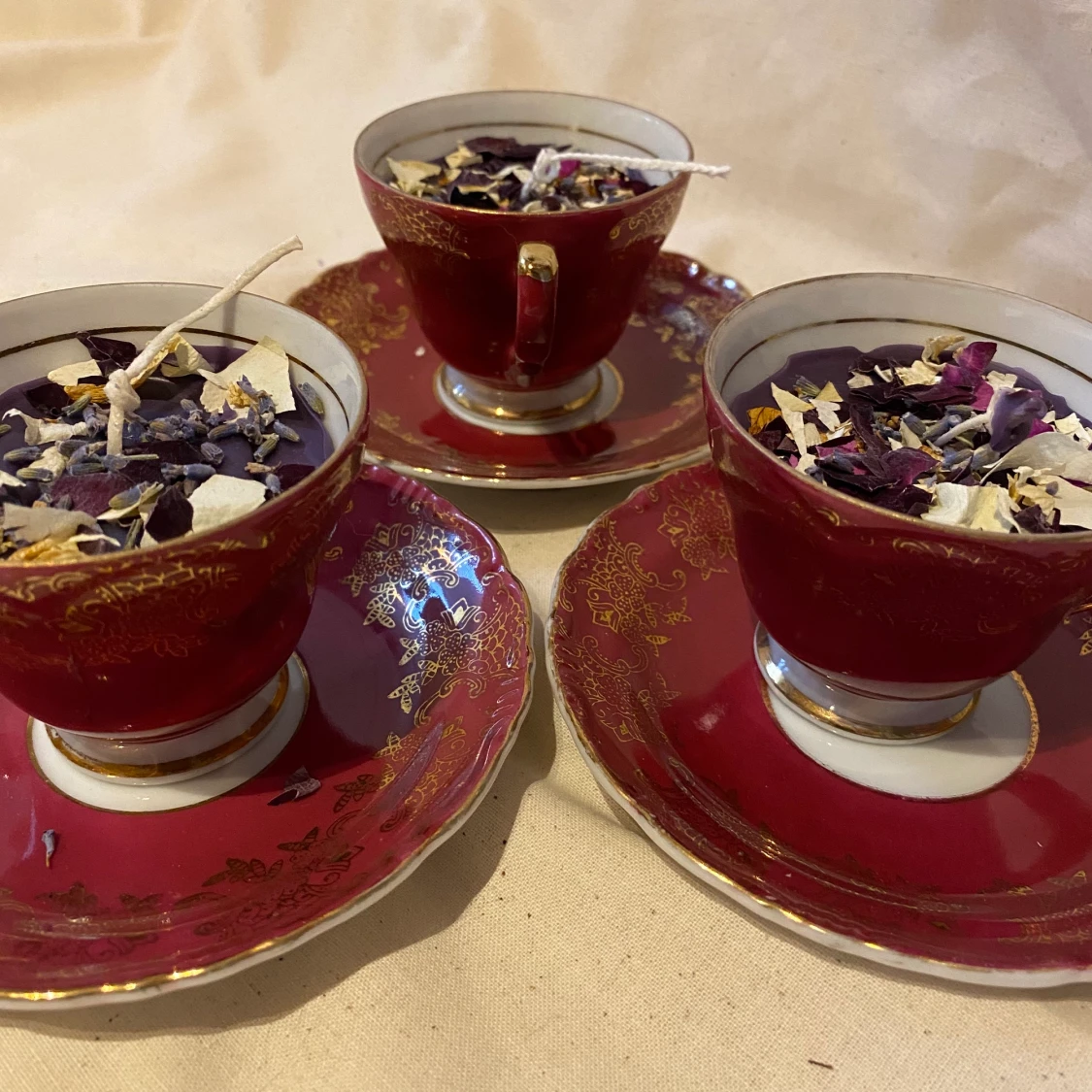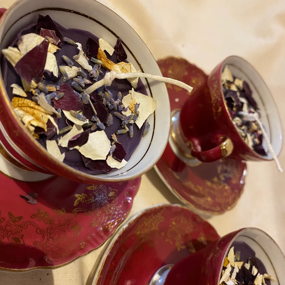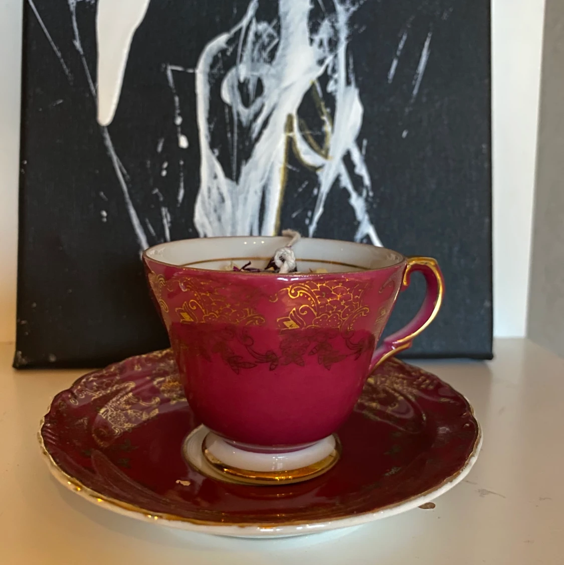 Handgjorda ljus i vackra röda retrokoppar. Innehåller rosenblad, lavendel och vanilj. Ljuvlig doft och perfekt för den som vill stilla sin oro. Varje kopp säljs med sitt fat och när ljuset brunnit ut får du en ny söt kopp. 🕯 se mer på min IG: KVINNOCRAFT