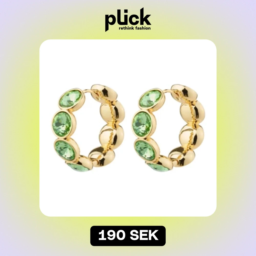 Guldpläterade hoops med gröna kristaller. Get ready to shine on the dance floor Mått 25 mm i diameter Gå all in på glam. Tillverkat av 83% återvunnet material. Nypris är 400kr. De är som i nycksick. Säljer även den matchande ringen i en annan annons.