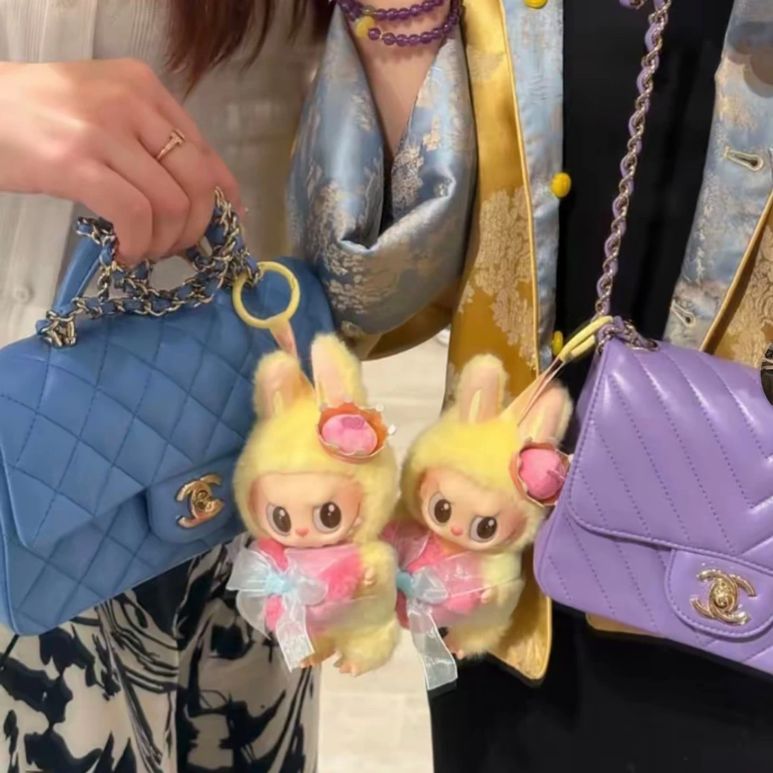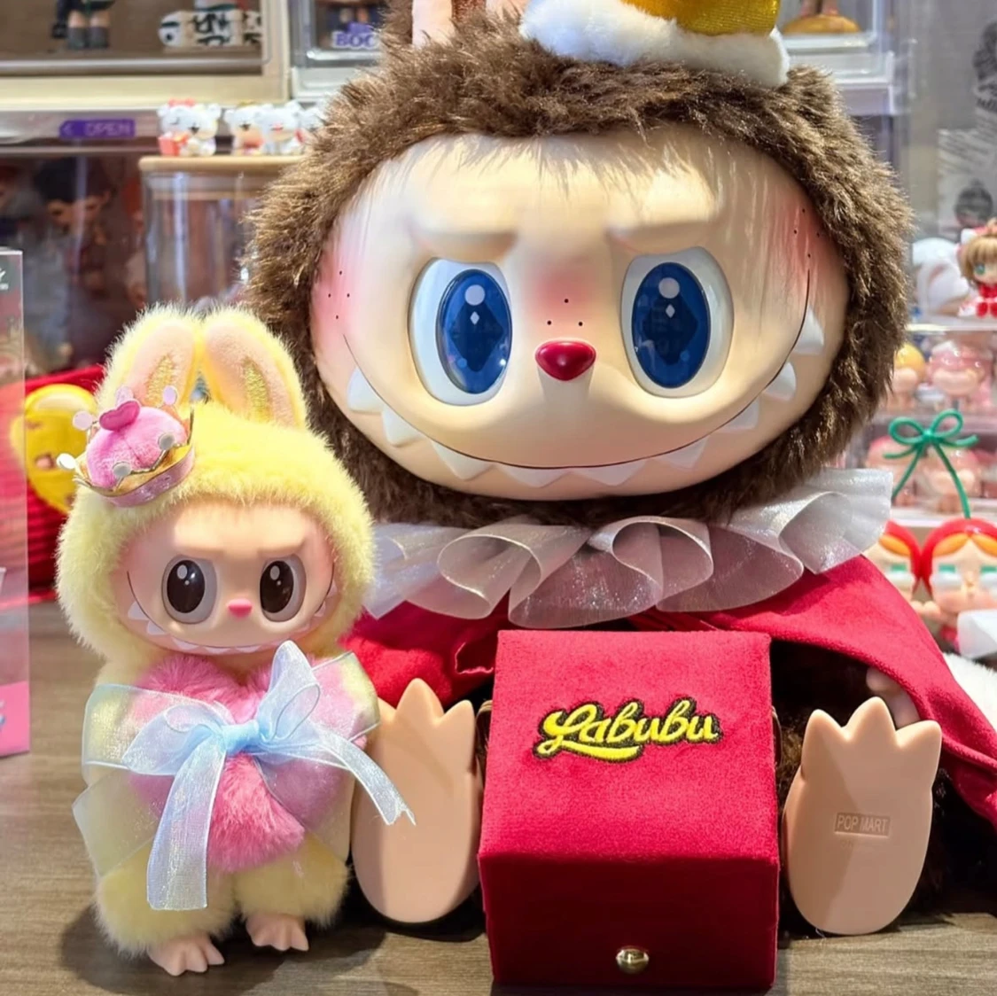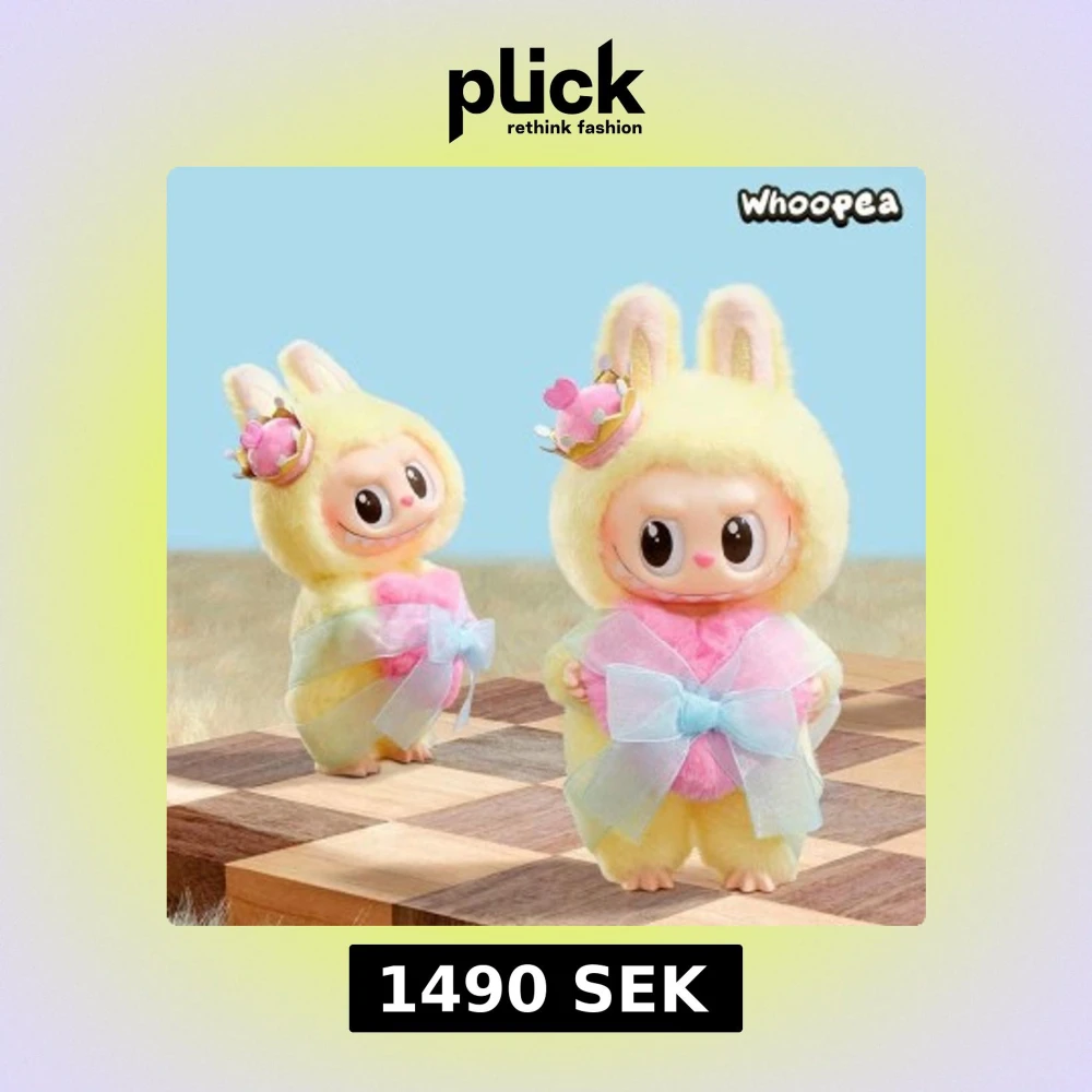 Söt Labubu-figur från Pop Mart, Let's Checkmate Bunny Edition. Mjuk gul och rosa dräkt med krona och stor rosett. Perfekt som samlarobjekt eller accessoar. Levereras i originalförpackning, nyskick utan synligt slitage eller defekter.