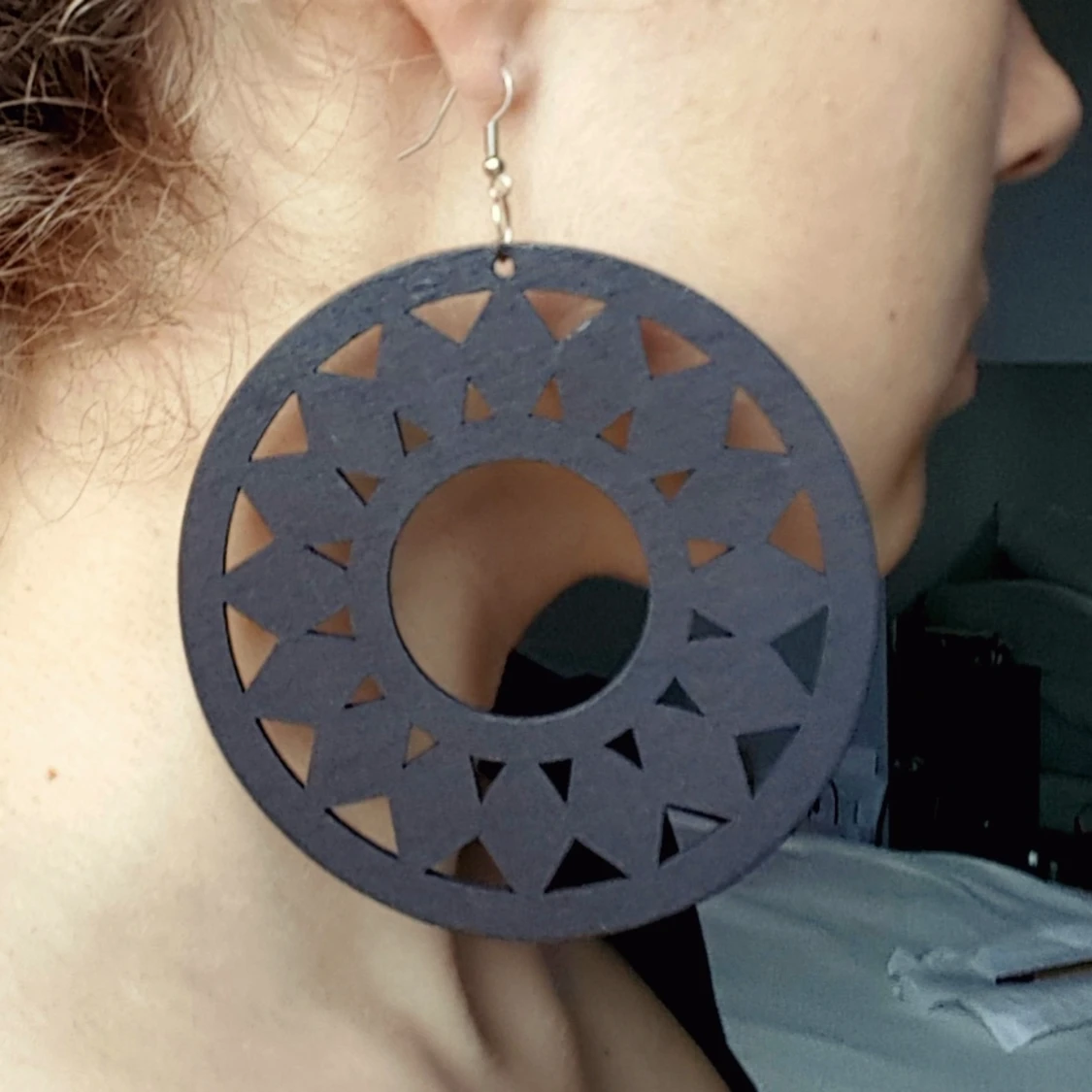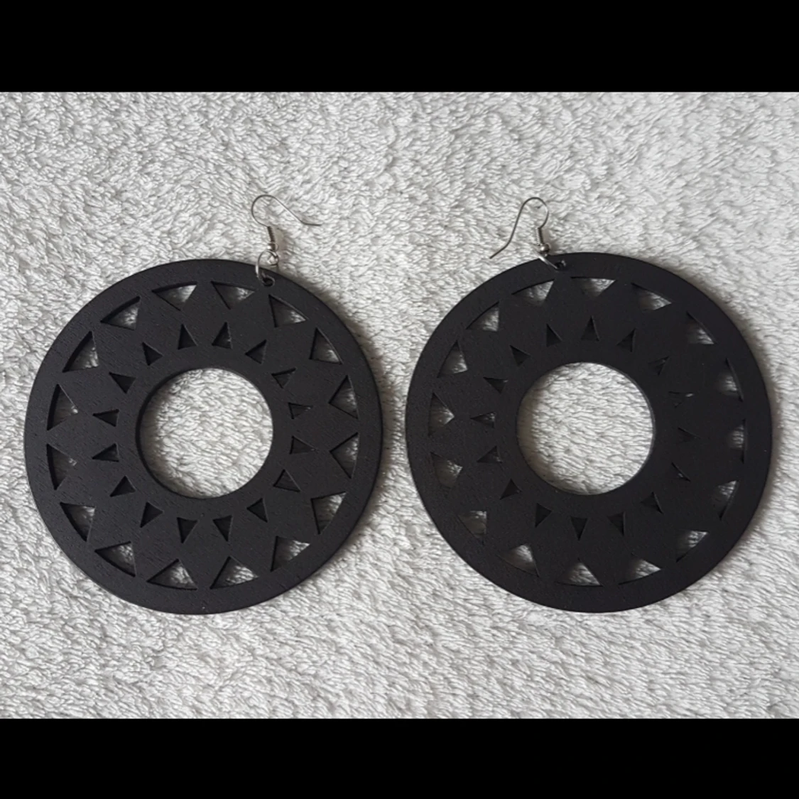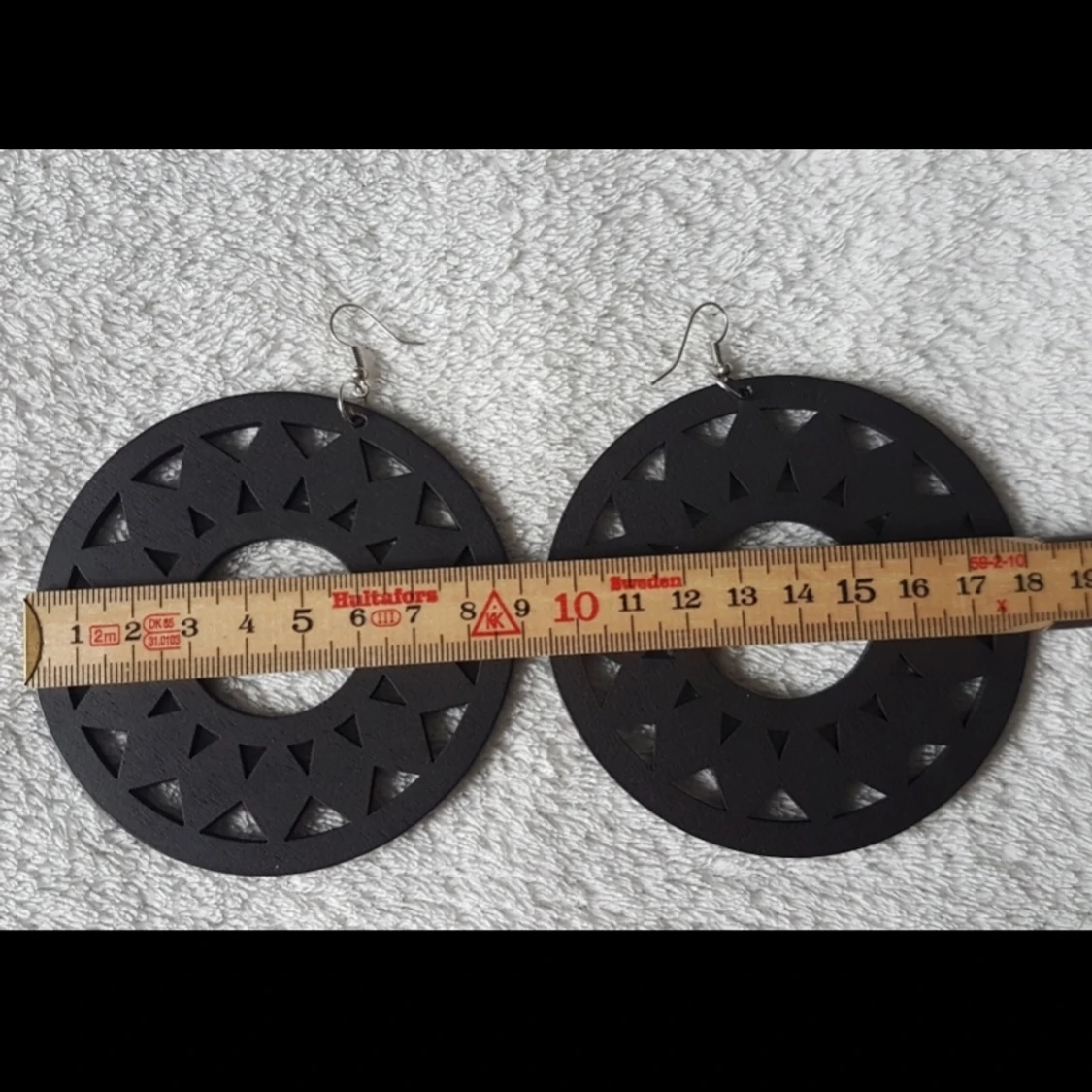 Ett par estetiska svarta örhängen. Beskrivning: Lätta, runda, svarta, solros 🌻 örhängen. 9cm i diameter. Oanvända. Frakt tillkommer med 24 kr.