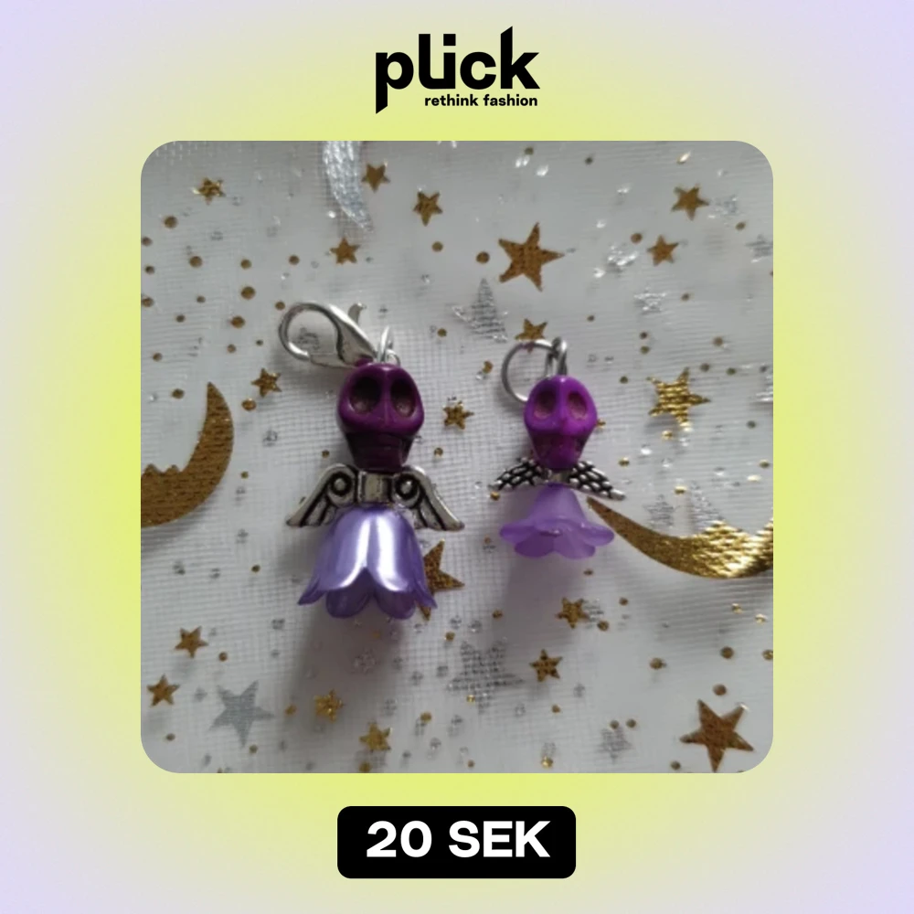 Två coola lila dödskalleberlocker. Berlockerna har små vingar och en blomliknande kjol i lila. Perfekta för att ge en unik touch till din outfit!