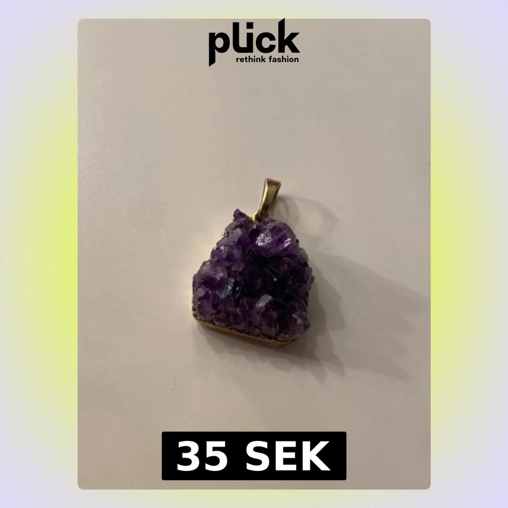 Unikt hänge med rå lila kristall på framsidan och guldfärgad kant. Hänget är i äkta ametist kristall men ej i äkta guld. Ljuset lyser igenom kristallen mer i verkligheten än på bild. Perfekt för ett unikt halsband! 🫶