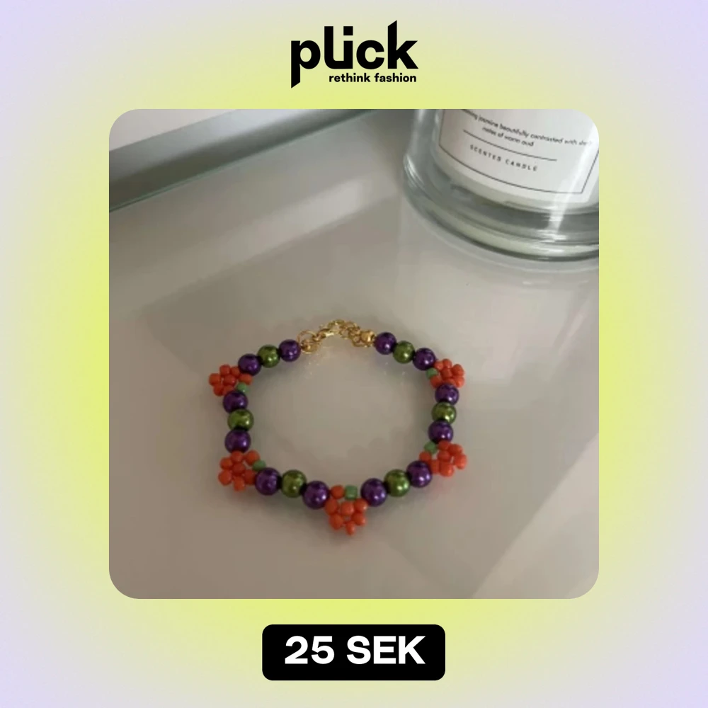 Säljer ett supercoolt armband med pärlor i lila, grönt och orange. Armbandet har små orange blommor som ger det en unik och lekfull stil. Perfekt för att liva upp vilken outfit som helst!