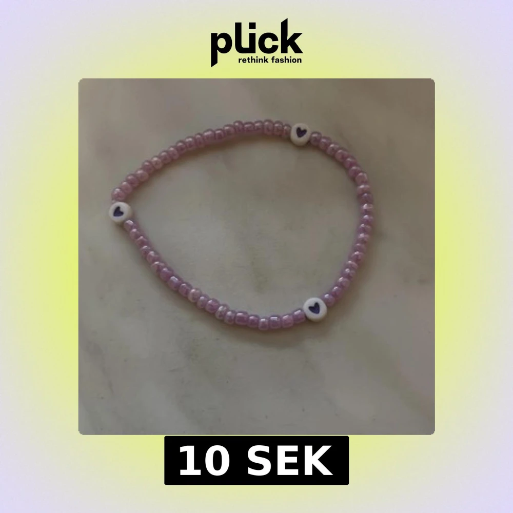 Sött armband med små lila pärlor och tre vita pärlor med lila hjärtan. Perfekt accessoar för att ge din outfit en gullig touch.
